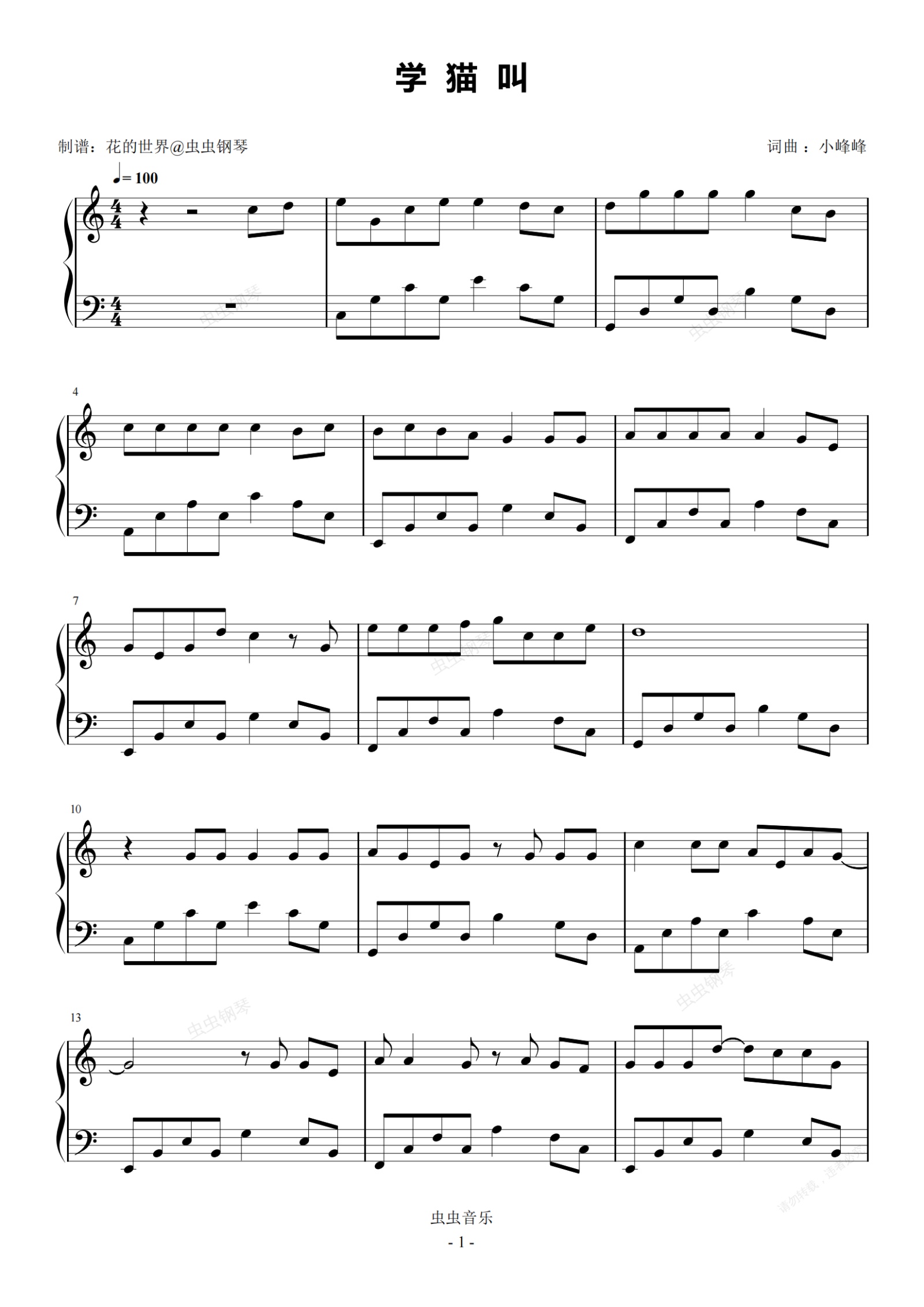 钢琴谱:学猫叫 C调简易版 小潘潘
