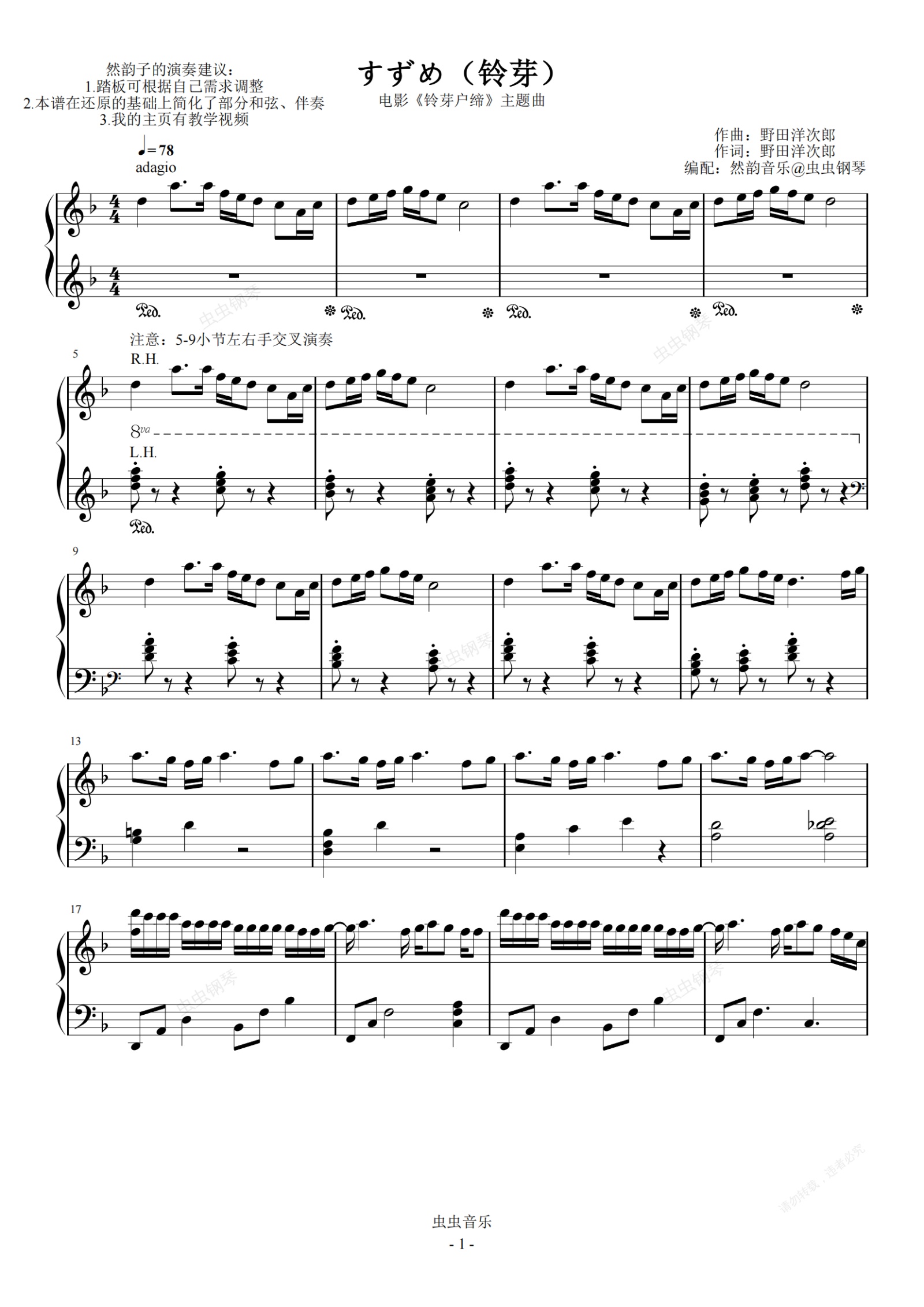 钢琴谱:铃芽户缔すずめ铃芽-《铃芽户缔》主题曲 唯美还原易弹版 然韵音乐编配 新海诚电影
