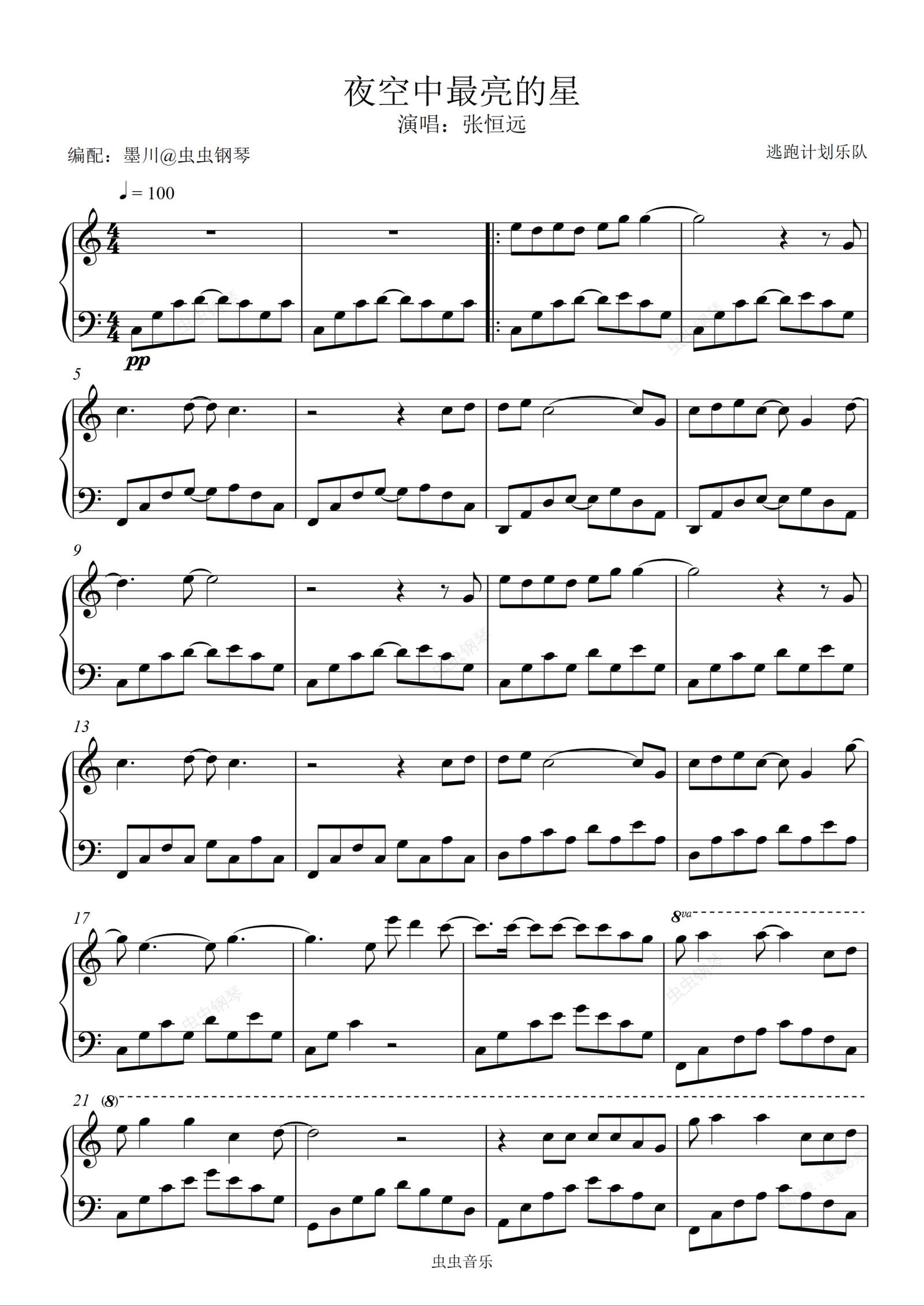 钢琴谱:夜空中最亮的星—逃跑计划乐队—C调简易