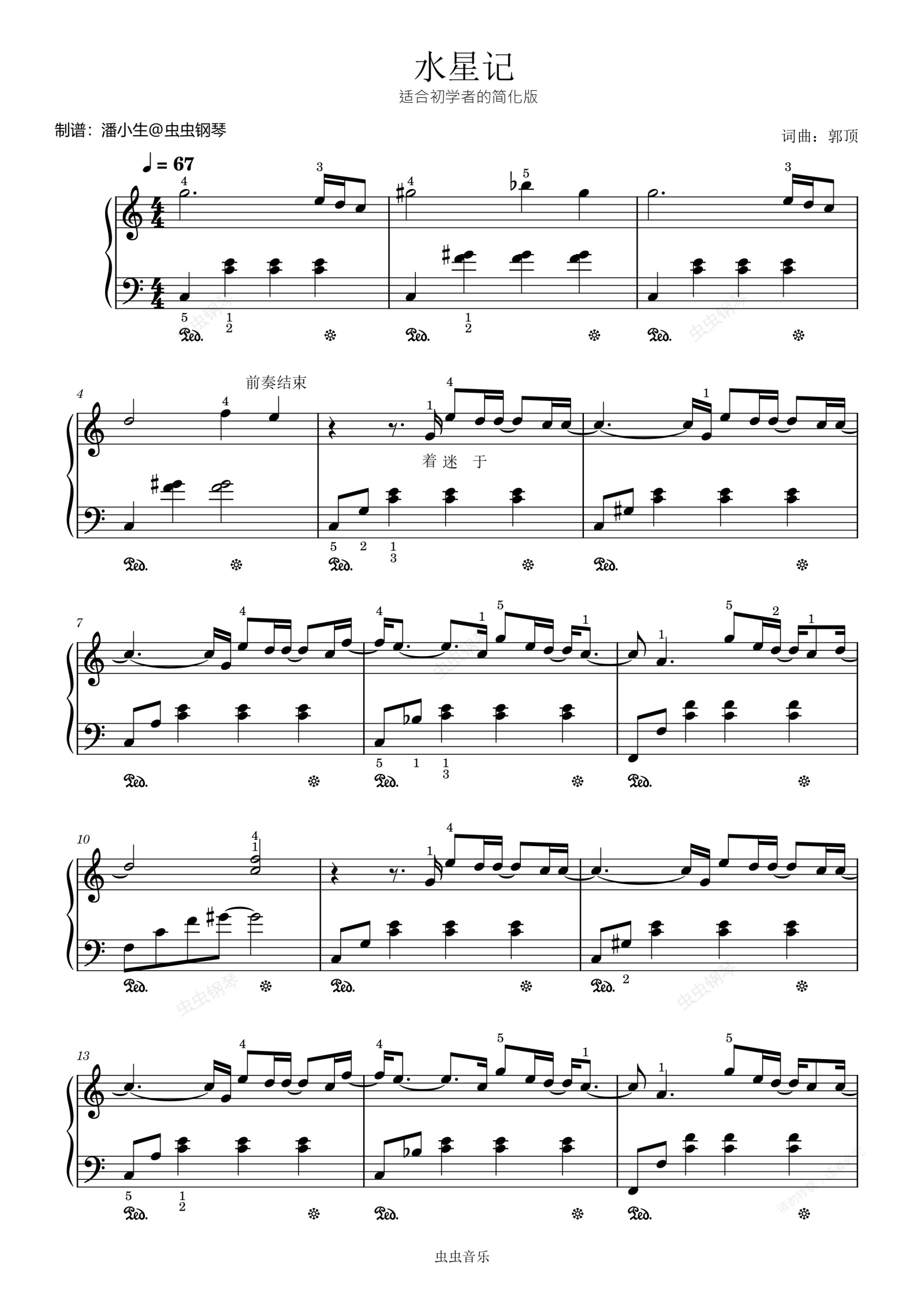 钢琴谱:水星记,初学者极简版,带指法C大调独奏谱,郭顶