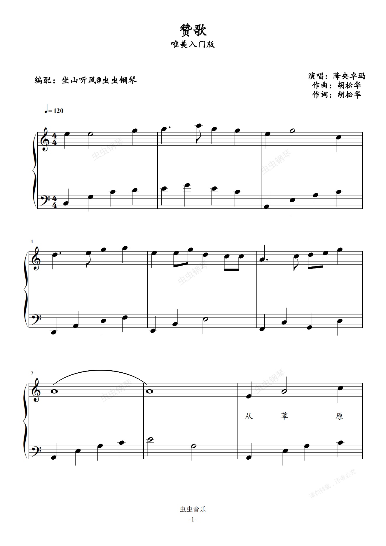钢琴谱:赞歌——唯美入门版【大音符+歌词】