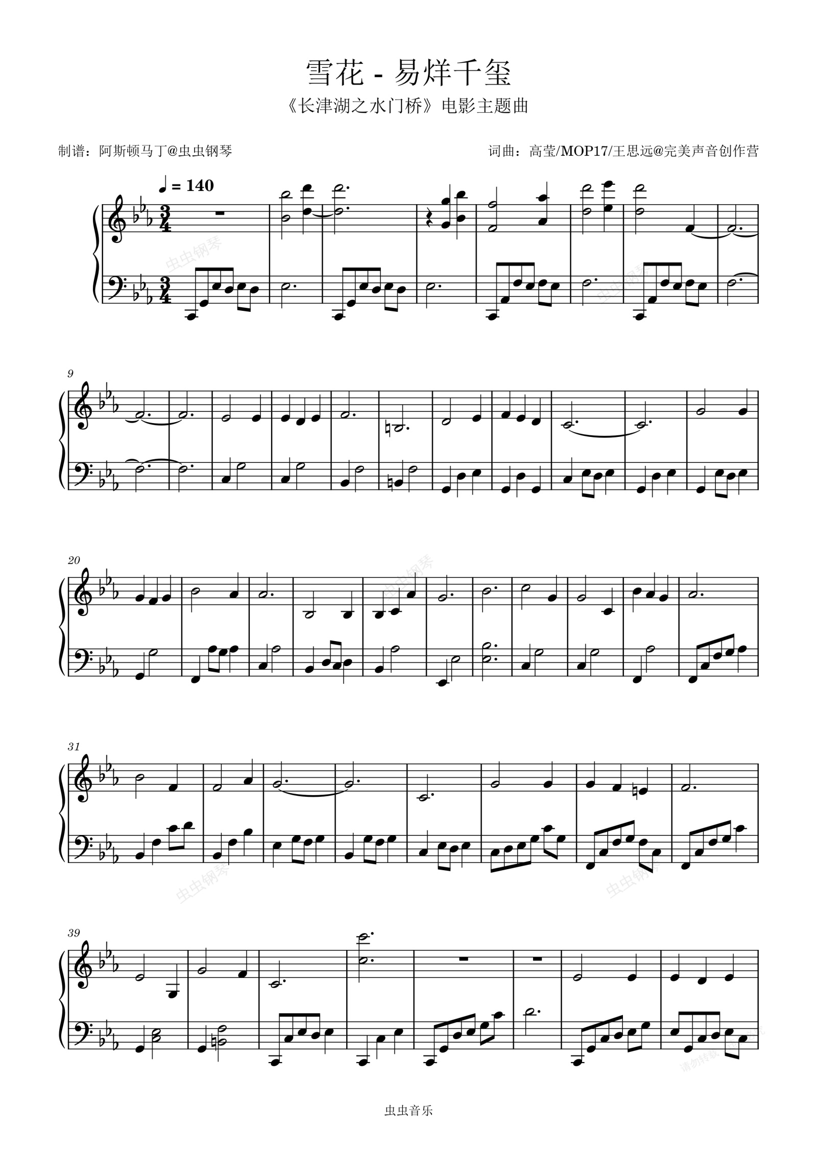 钢琴谱:雪花 (《长津湖之水门桥》电影主题曲) - 易烊千玺【独奏】