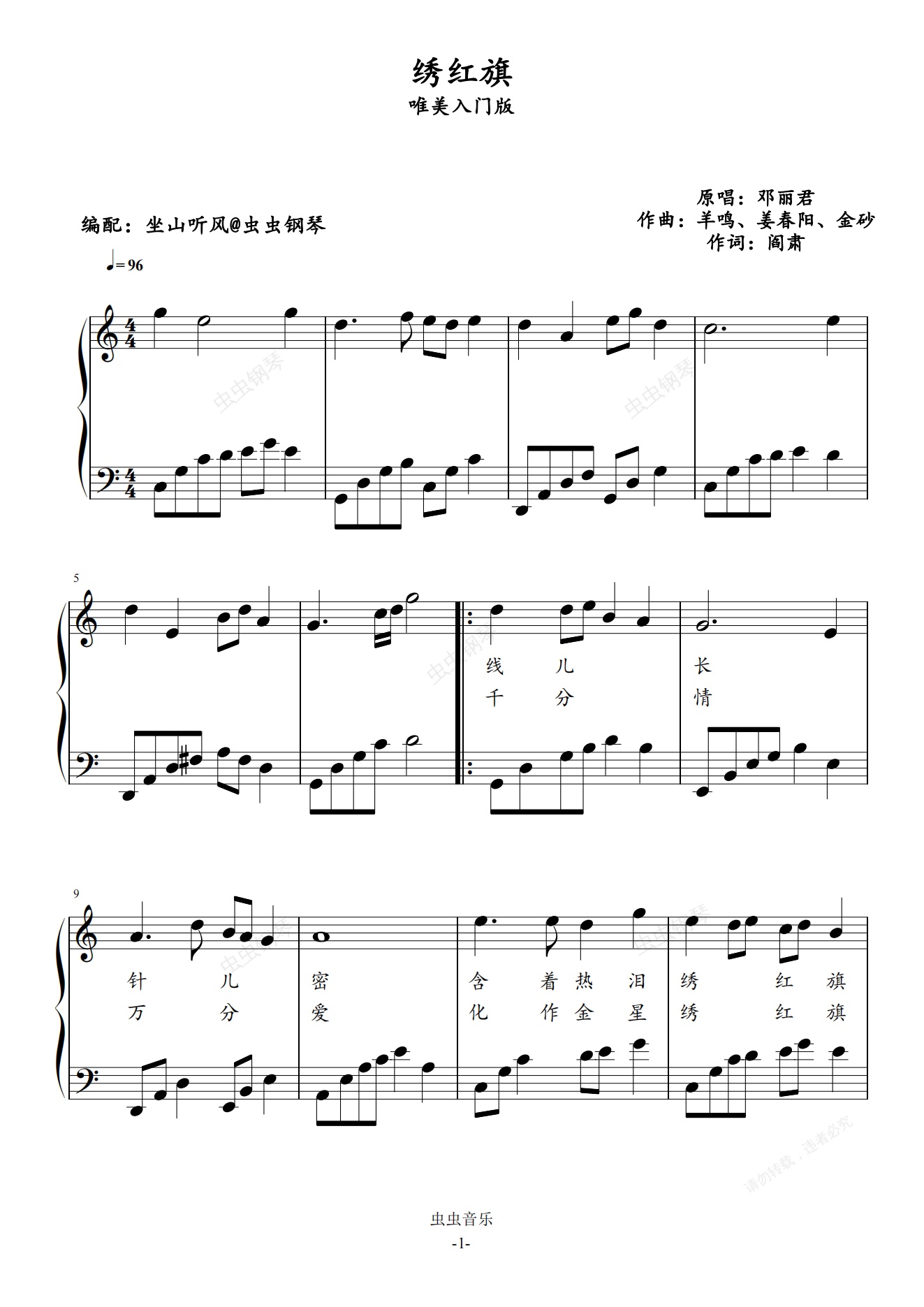 钢琴谱:绣红旗——唯美入门版【大音符+歌词】