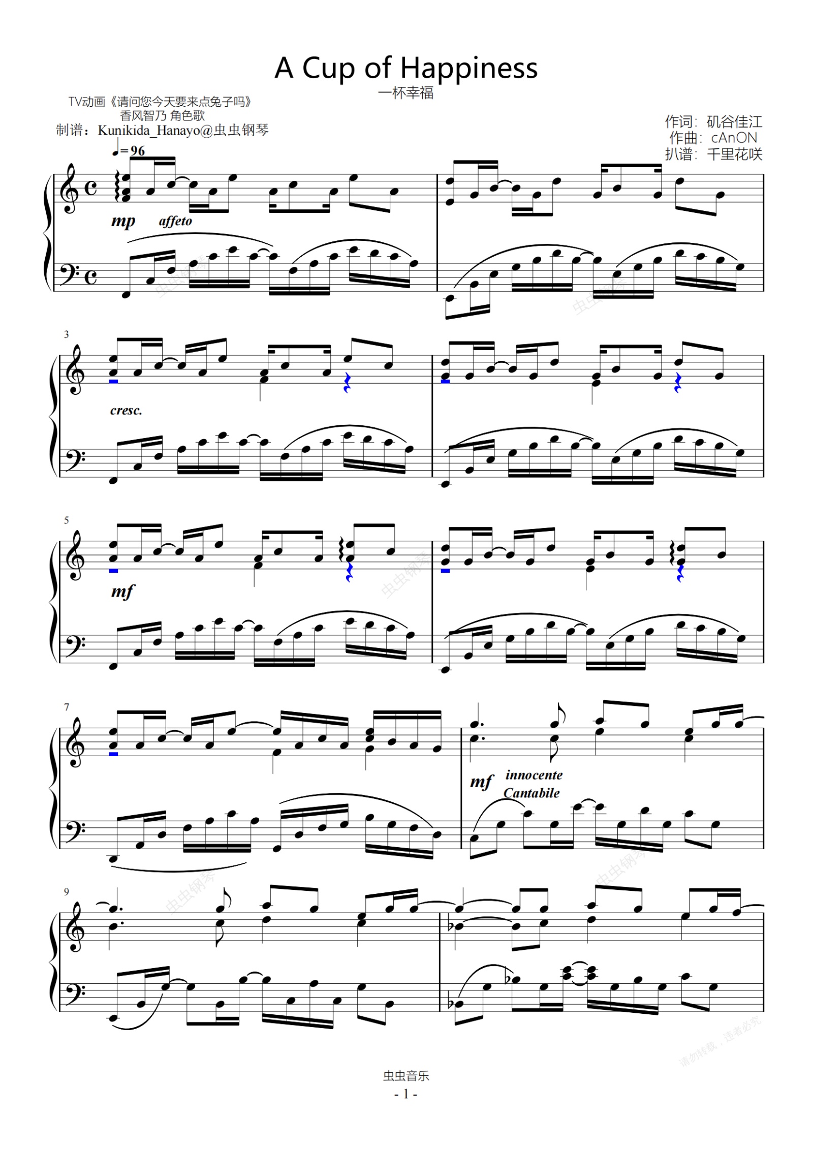 钢琴谱:【点兔】香风智乃角色歌~A cup of happiness