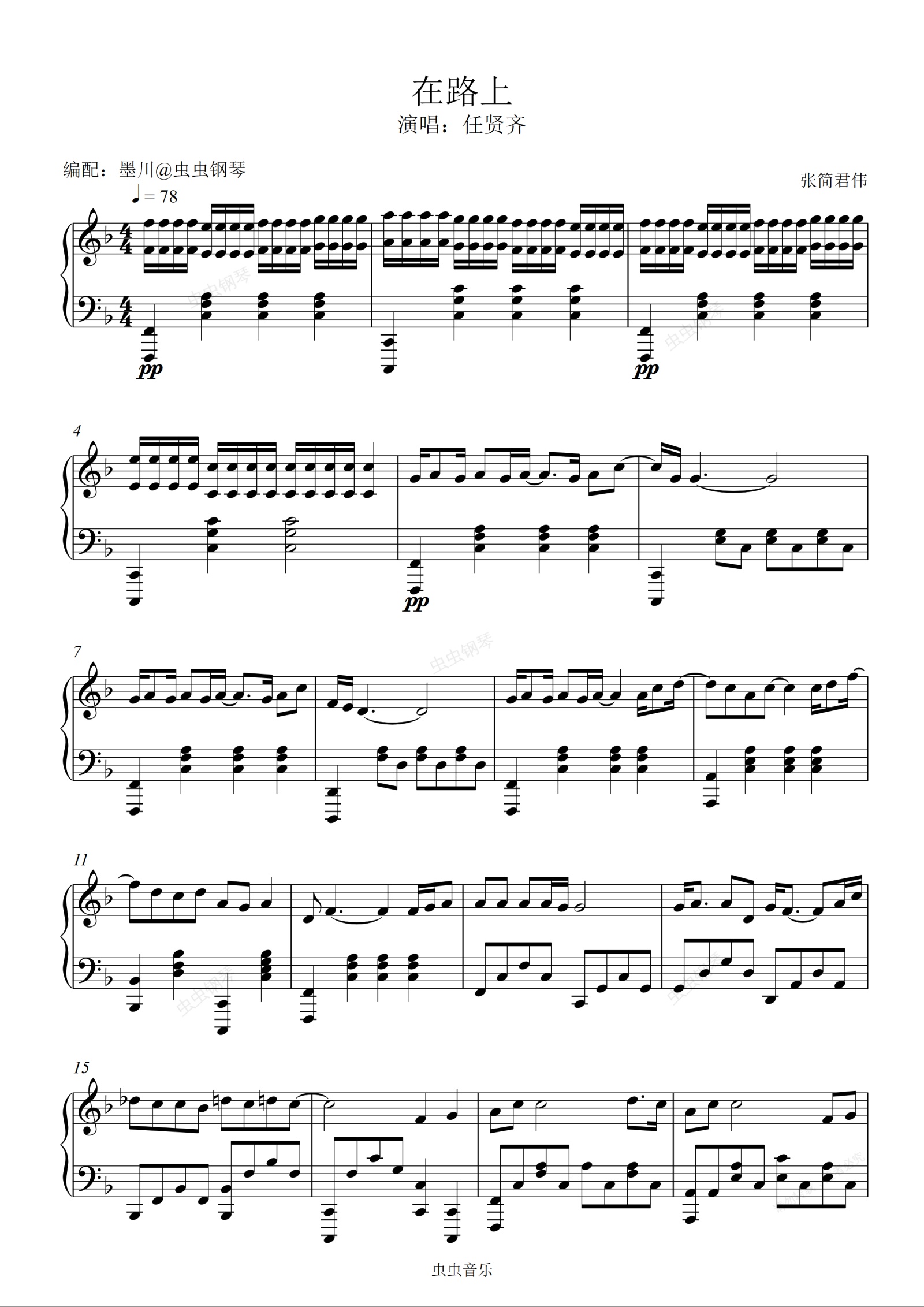 钢琴谱:在路上—任贤齐—F调扒谱编配