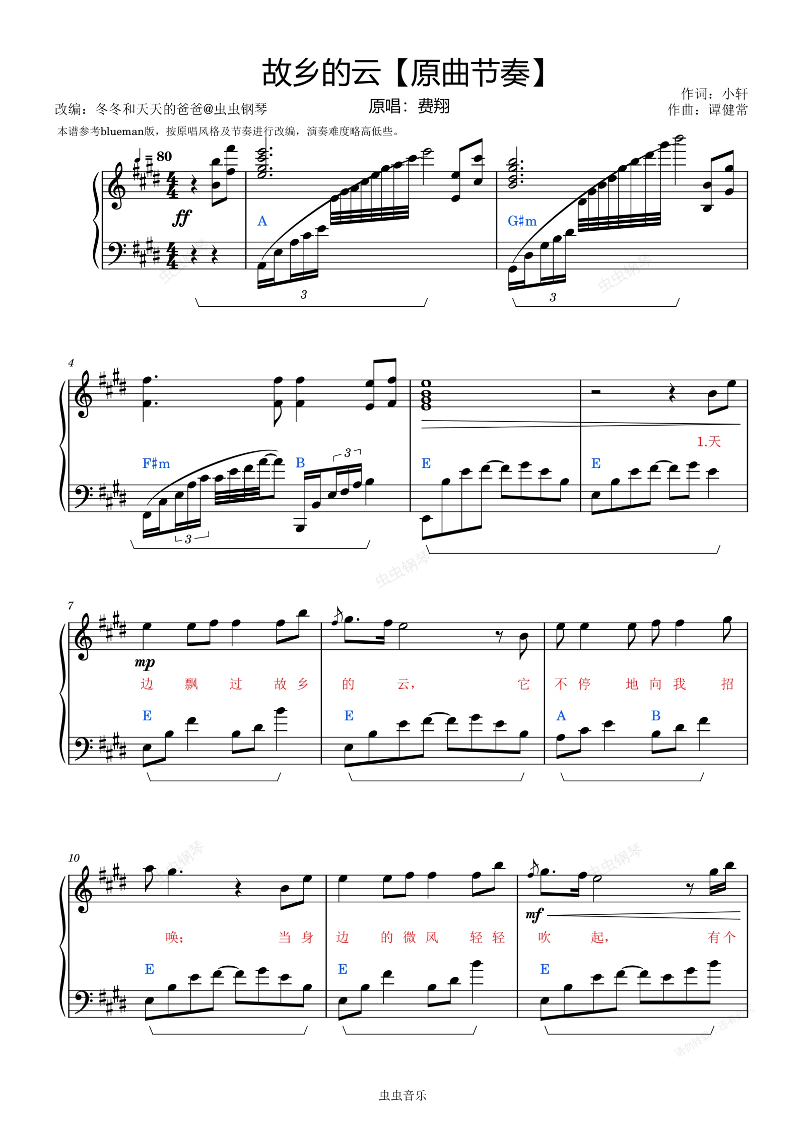 钢琴谱:故乡的云-费翔-原曲节奏版-E调