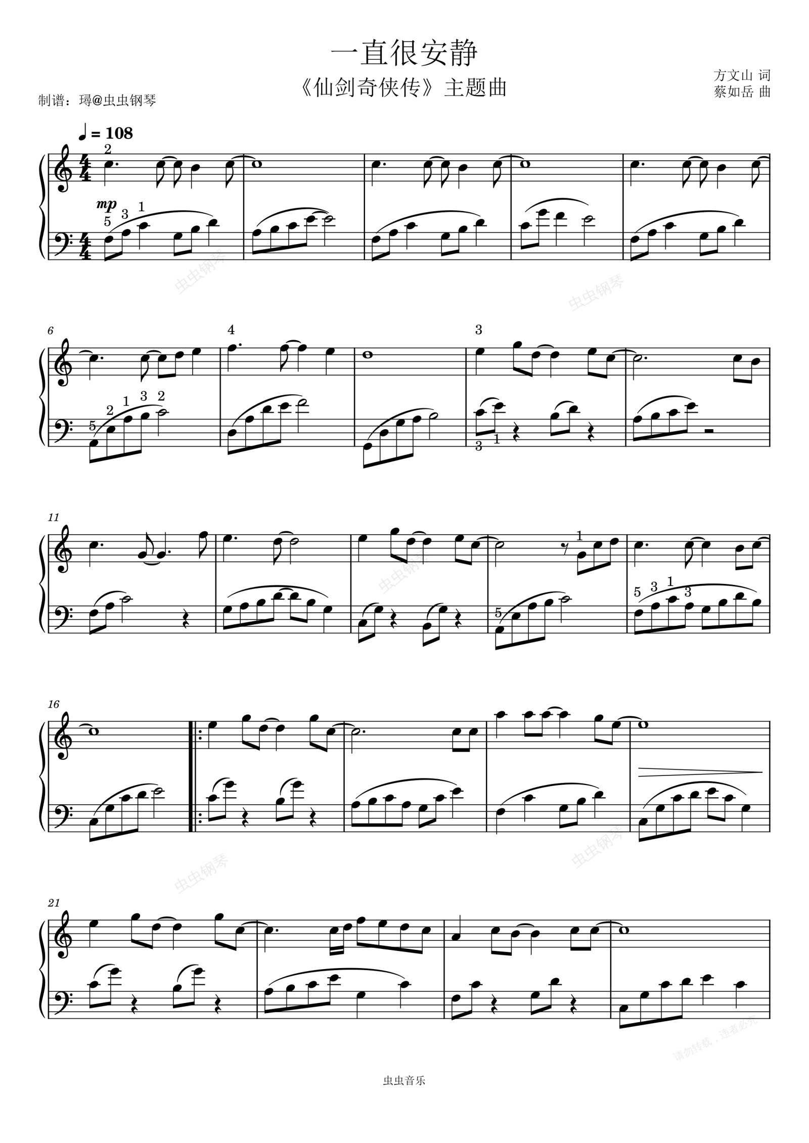 钢琴谱:一直很安静带指法