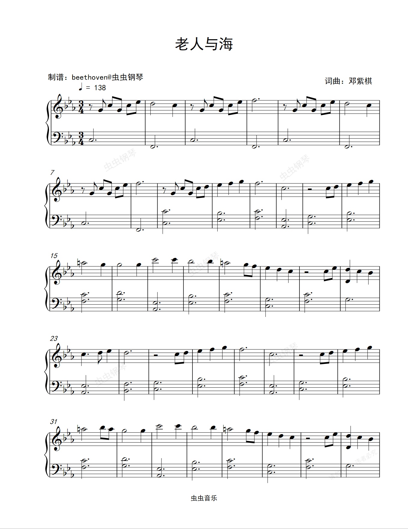 钢琴谱:老人与海-邓紫棋-简单完整版