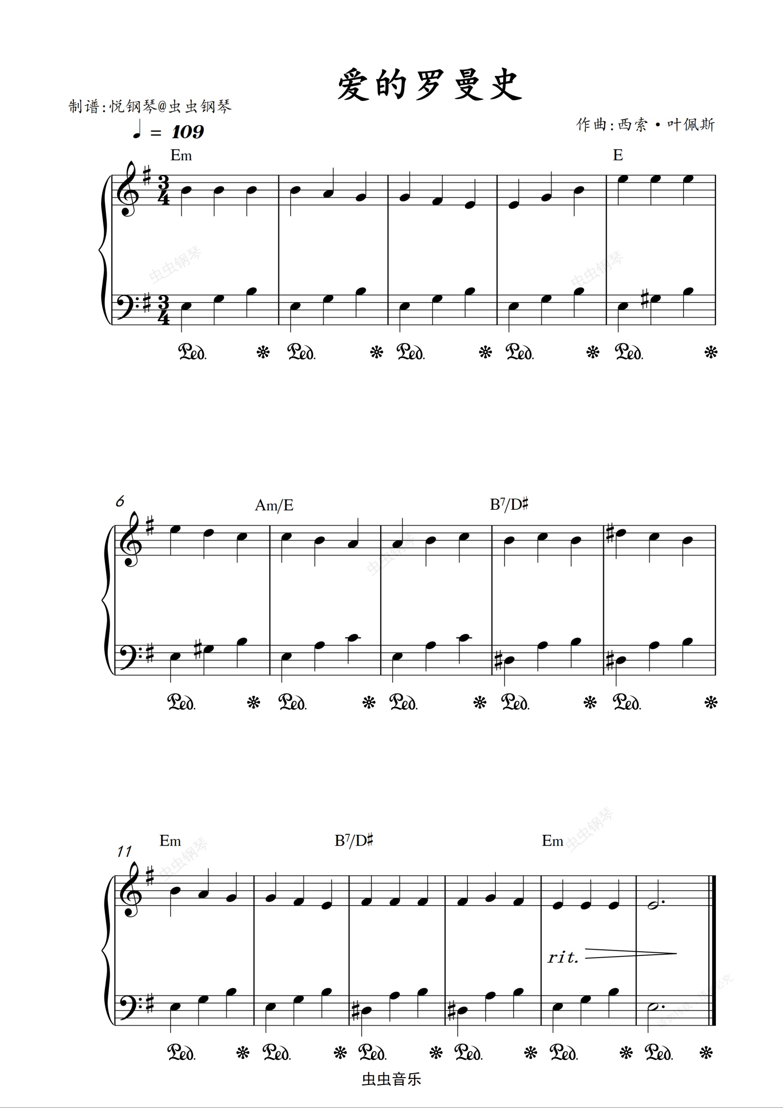 钢琴谱:爱的罗曼史 (免费乐谱)简易版