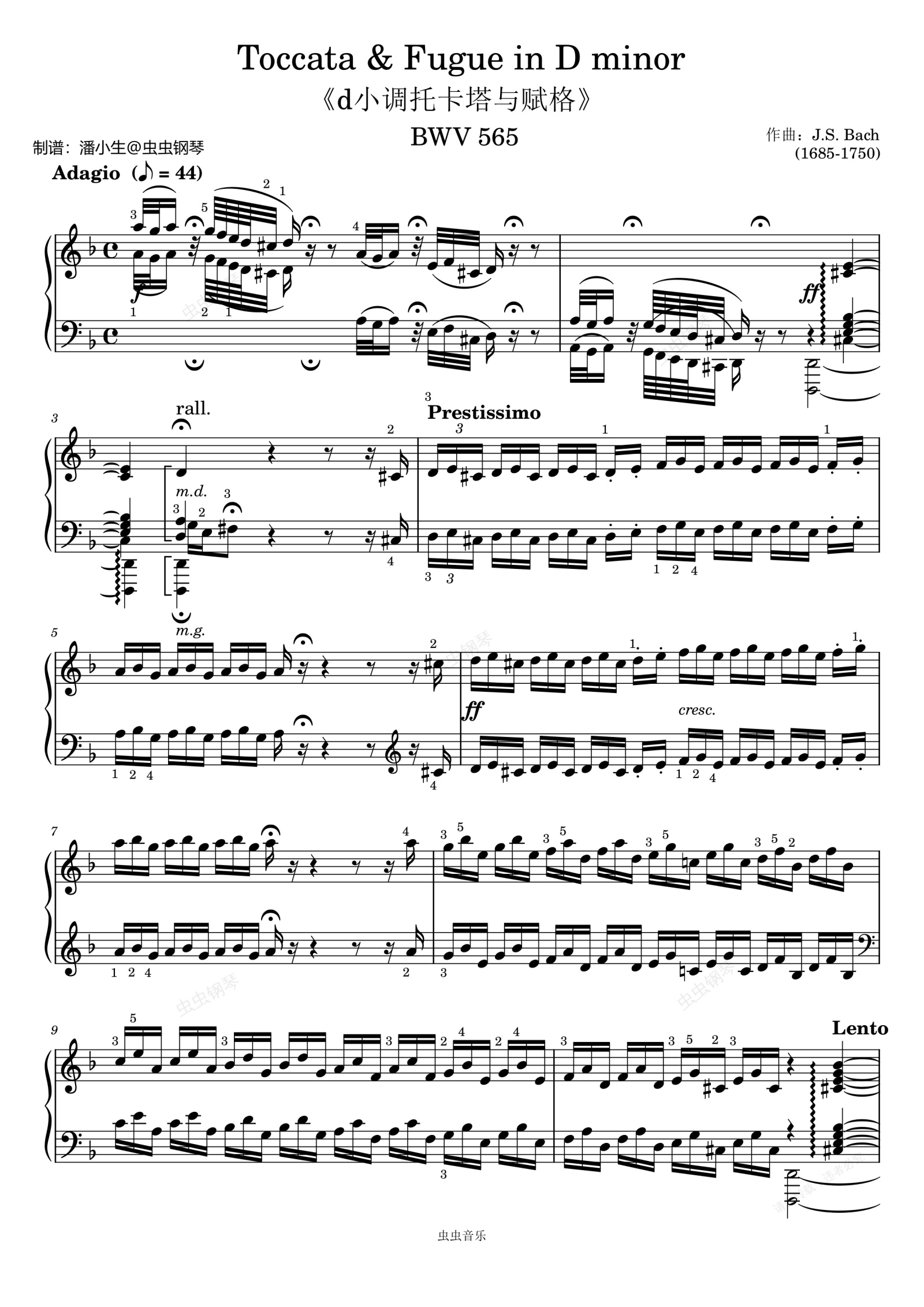 钢琴谱:《d小调托卡塔与赋格》BWV 565,原版带指法,巴赫 Toccata and Fugue in D minor