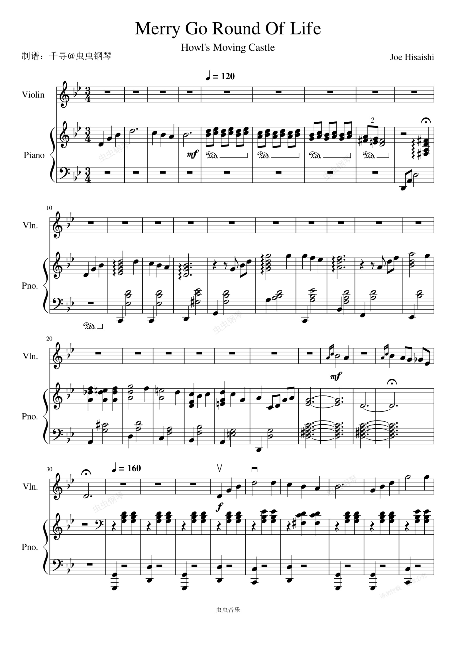 钢琴谱:《人生象旋转木马》-哈尔的移动城堡 - Merry Go Round Of Life(钢琴+小提琴)