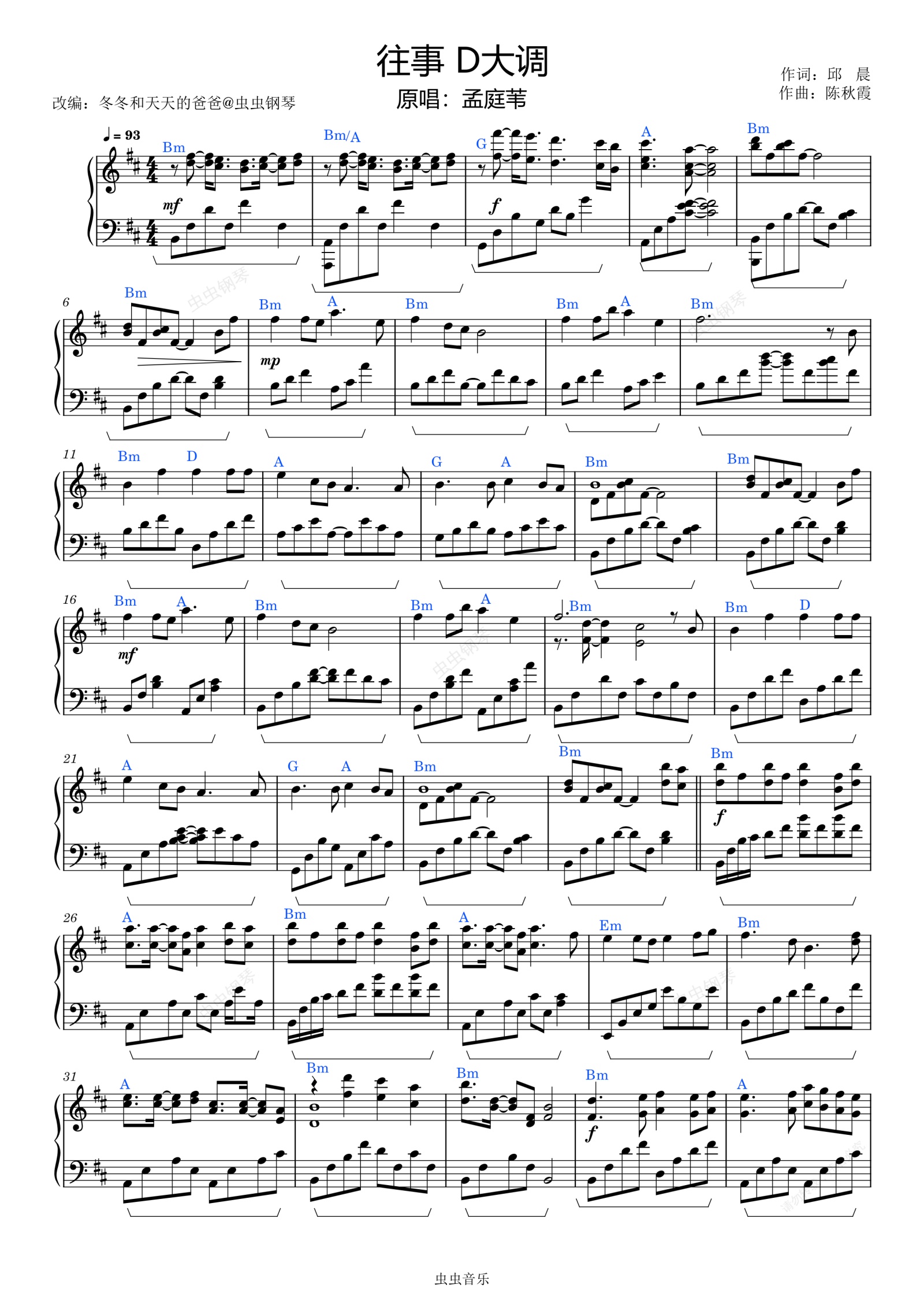 钢琴谱:往事 孟庭苇 D大调【完整版】