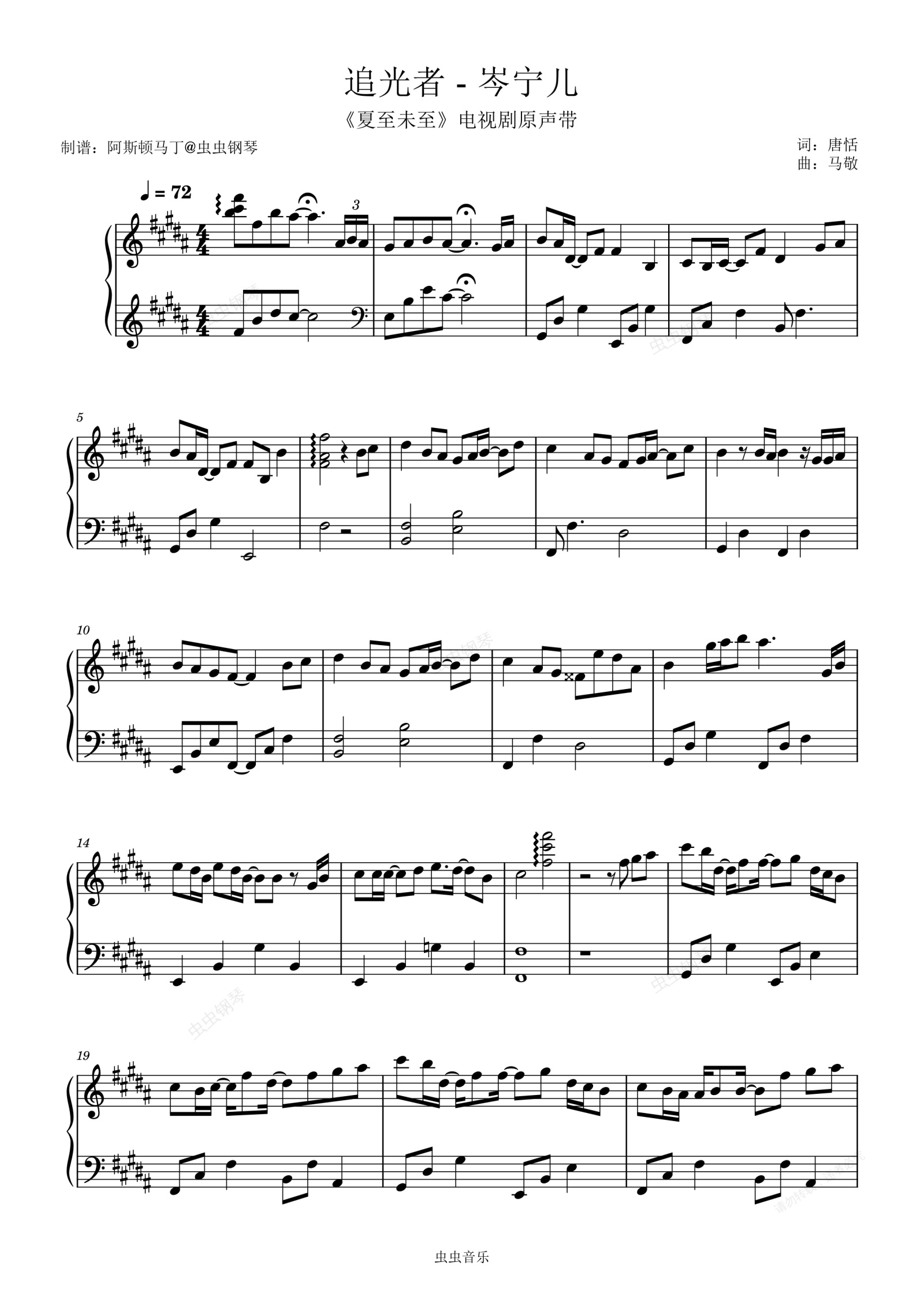 钢琴谱:追光者 - 岑宁儿 (《夏至未至》电视剧原声带)【独奏】