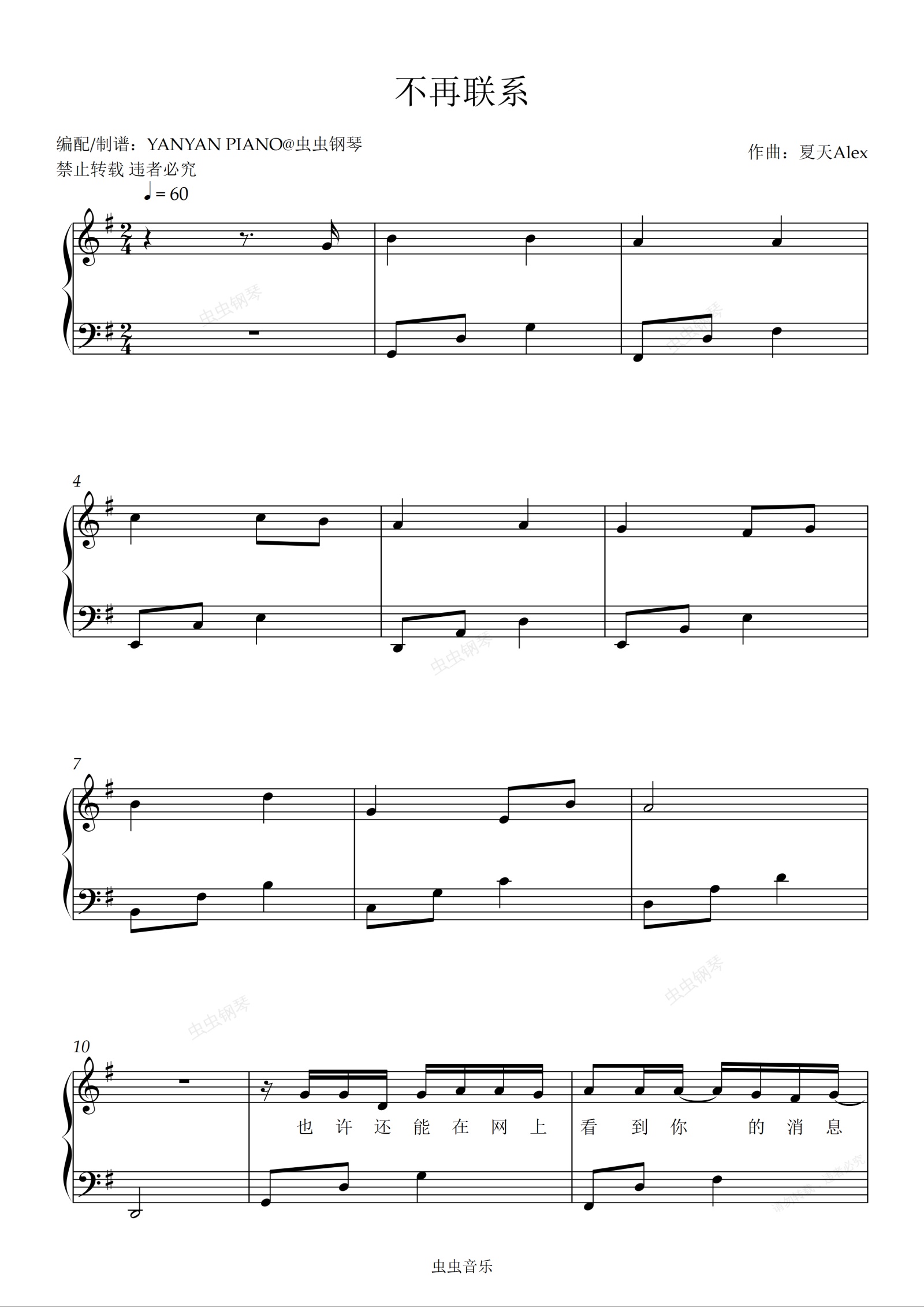 钢琴谱:好听易弹【不再联系】夏天Alex