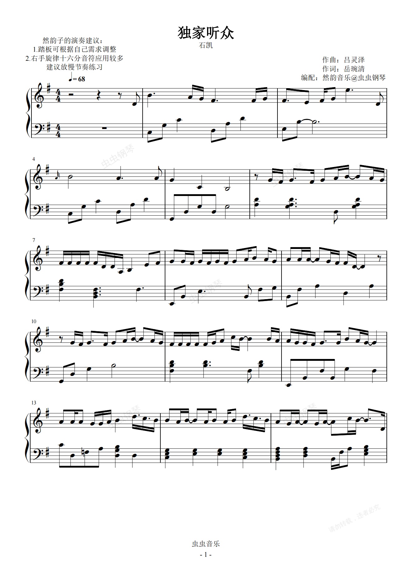 钢琴谱:独家听众-石凯 极限还原易弹版 然韵音乐编配