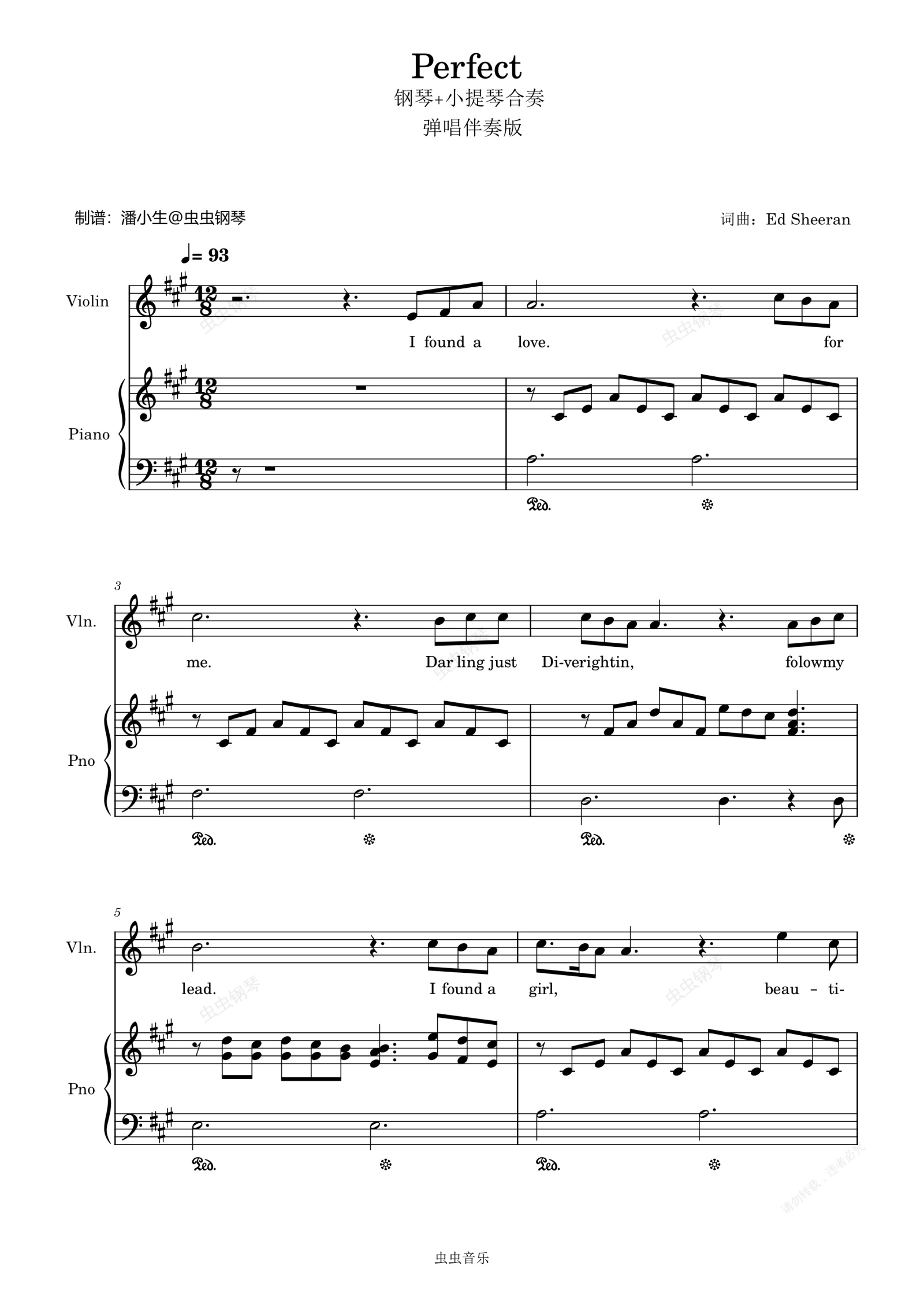 钢琴谱:Perfect,A大调弹唱伴奏谱,钢琴+小提琴,Ed Sheeran,黄老板,完美无暇