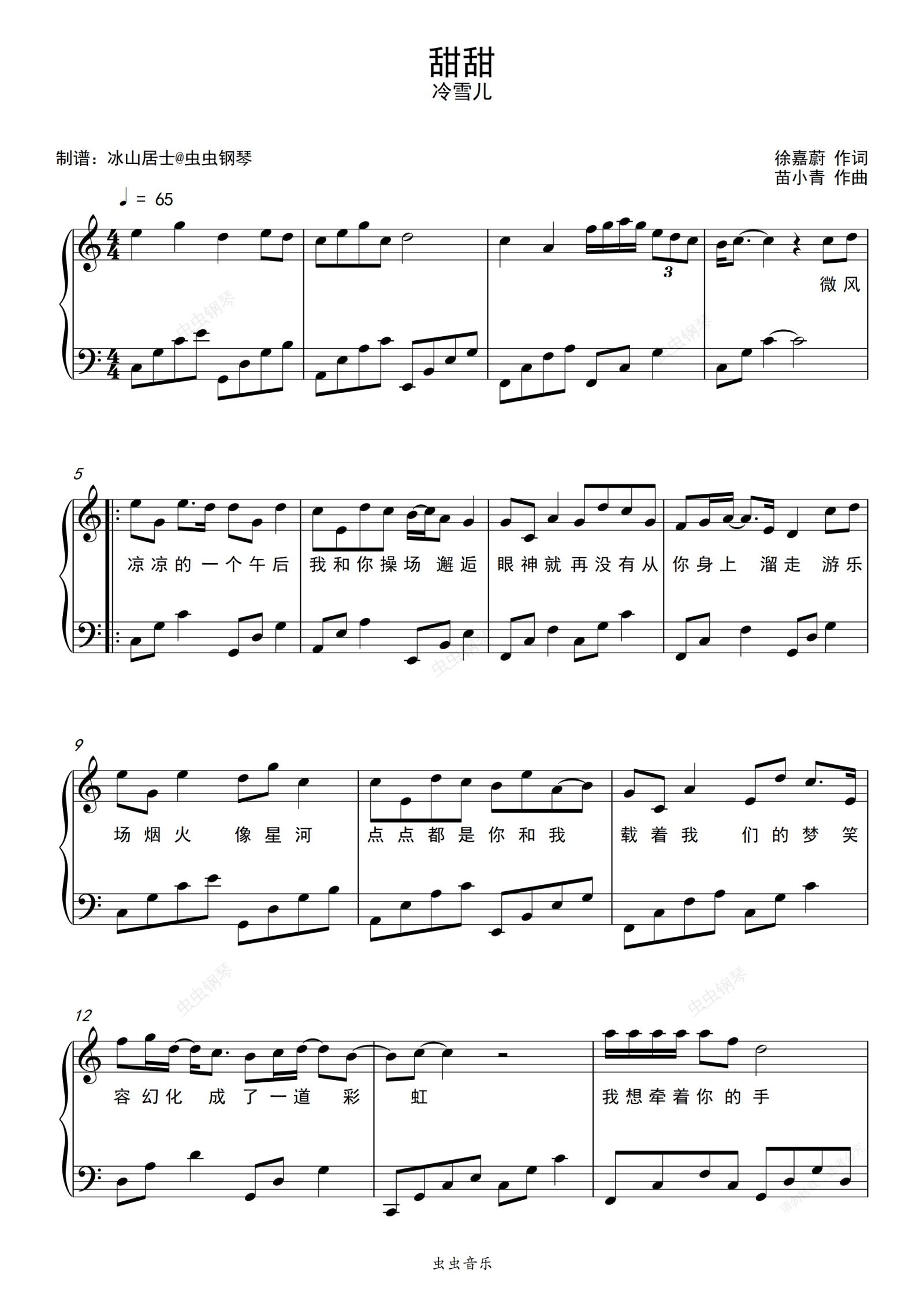 钢琴谱:甜甜钢琴谱C调_冷雪儿