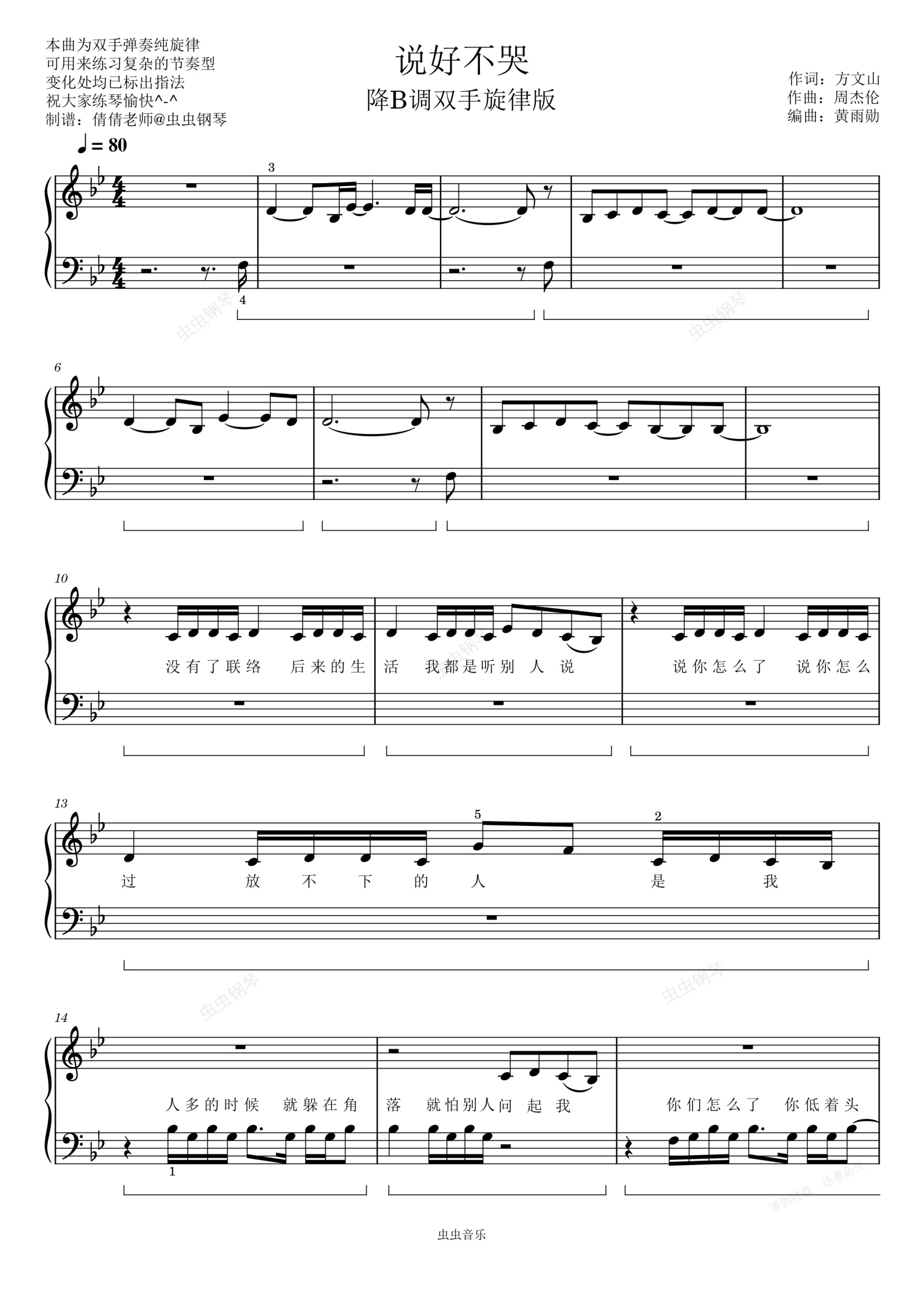 钢琴谱:说好不哭-周杰伦-初学简易纯旋律降B调