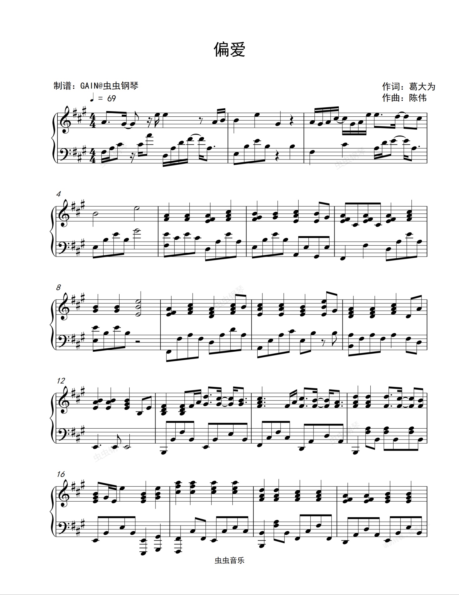 钢琴谱:偏爱-张京云-完美弹唱版