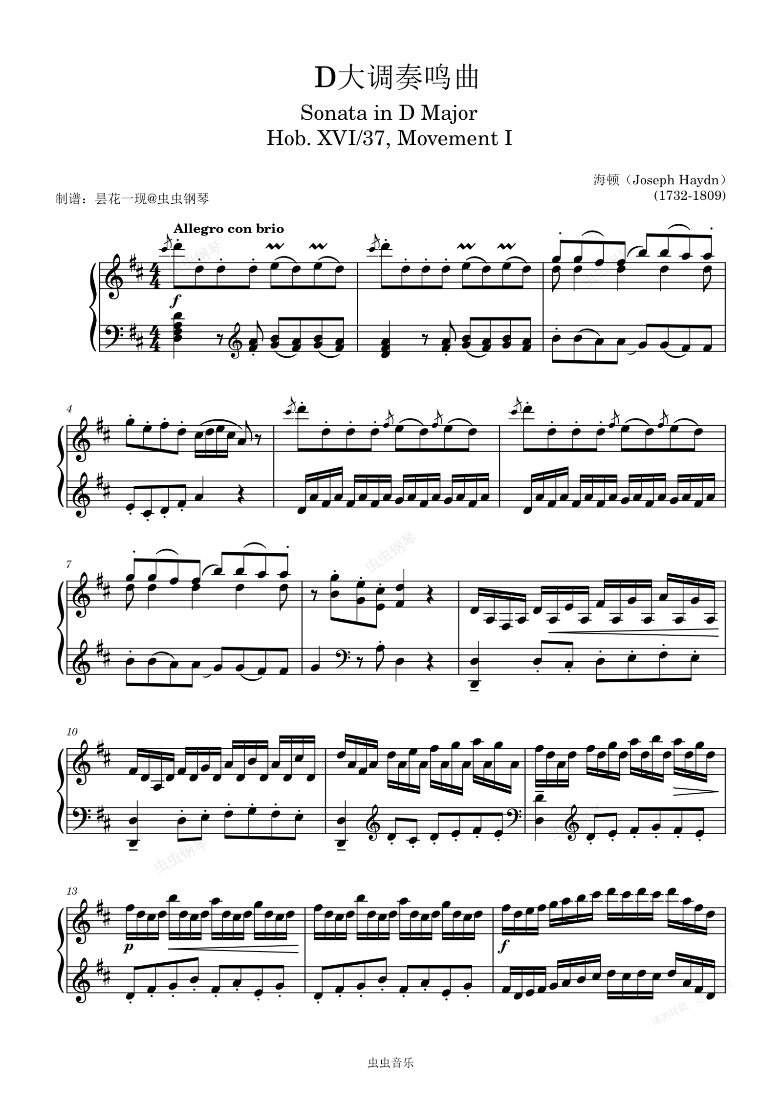 钢琴谱:D大调奏鸣曲 Hob. XVI/37, Movement I