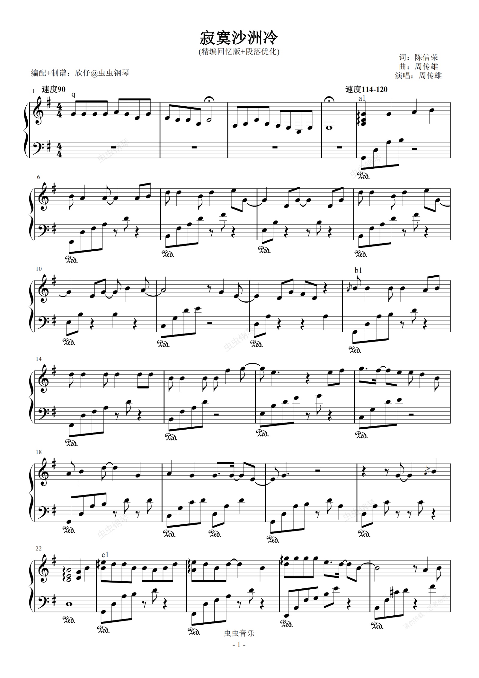 钢琴谱:周传雄-G《寂寞沙洲冷》(精编回忆版+段落优化)