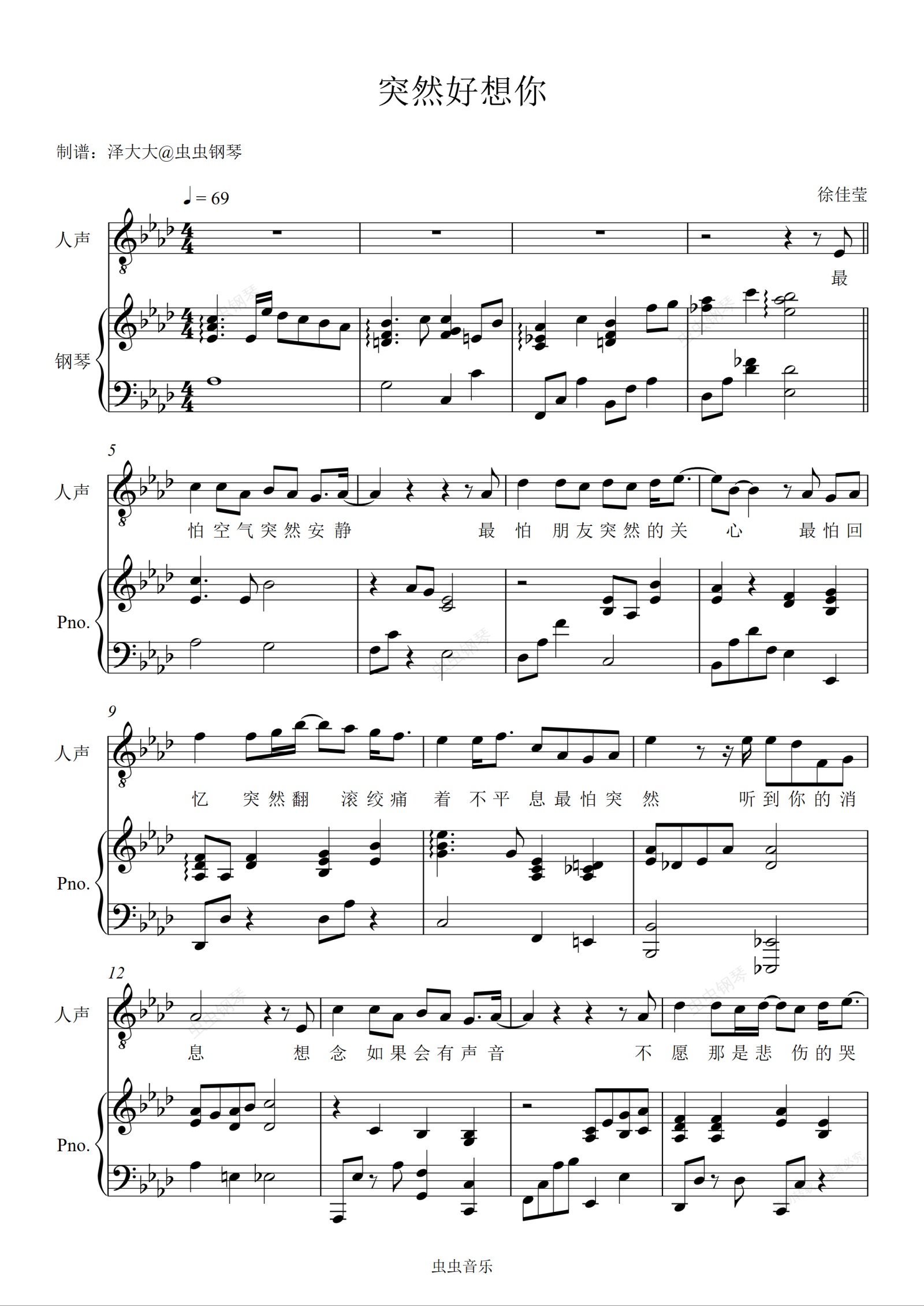 钢琴谱:突然好想你【徐佳莹女版弹唱附词】泽大大 徐佳莹