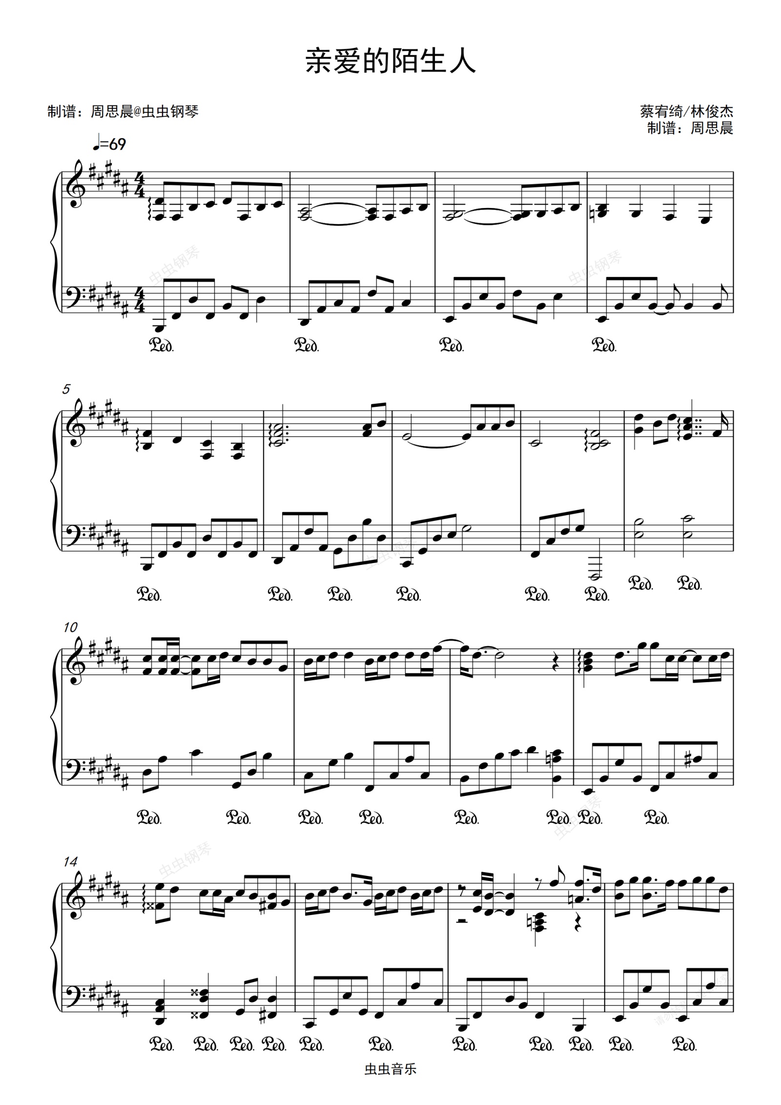 钢琴谱:亲爱的陌生人 林俊杰/蔡宥绮 B调原调完美独奏