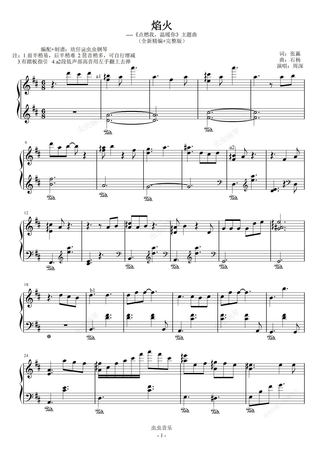 钢琴谱:周深-D《焰火》(《点燃我,温暖你》主题曲,完整版)