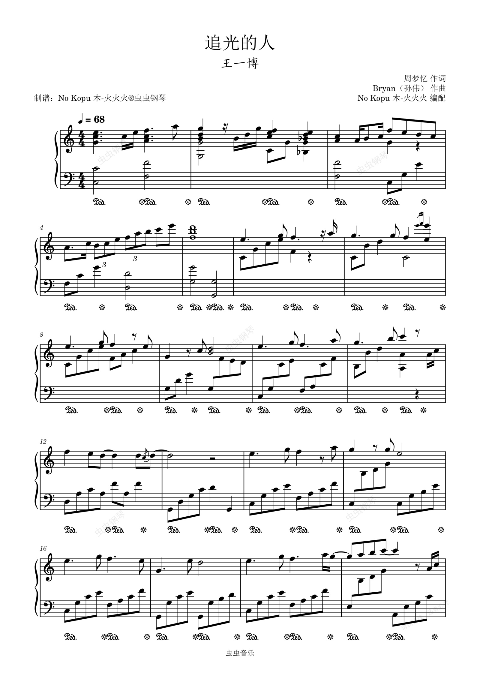 钢琴谱:《追光的人》C调-简单易上手,王一博