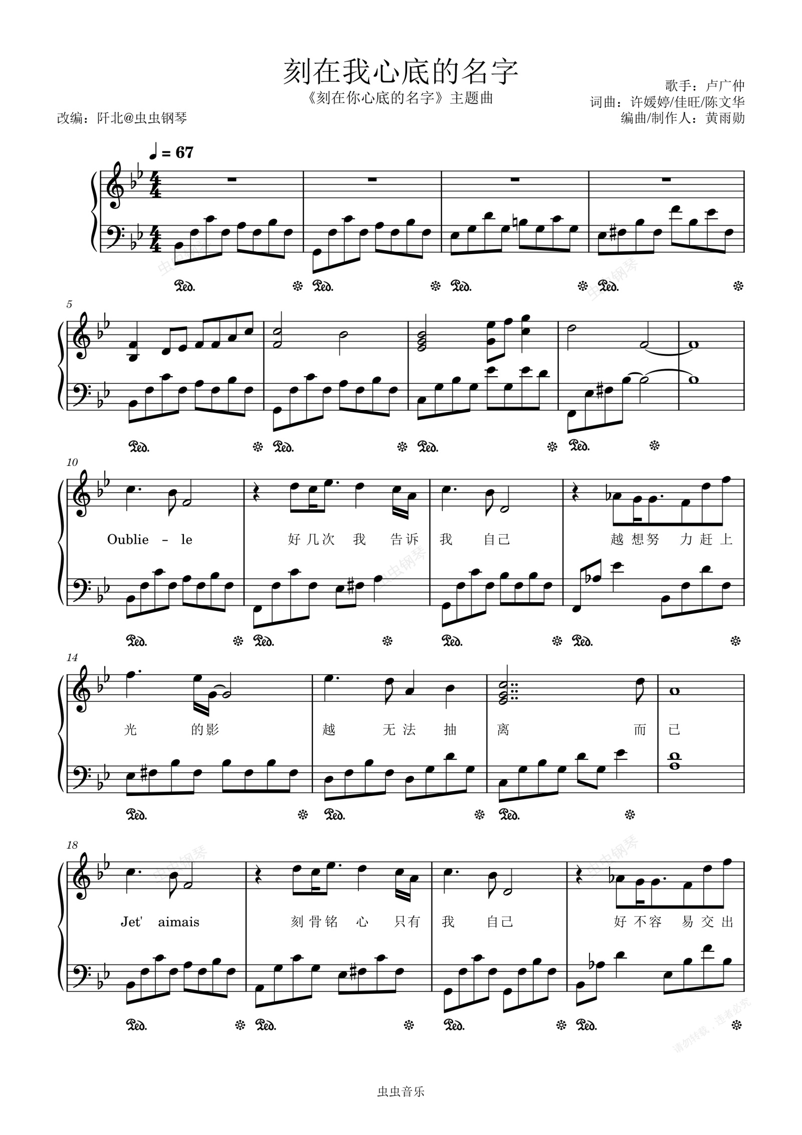 钢琴谱:【免费】《刻在我心底的名字》卢广仲