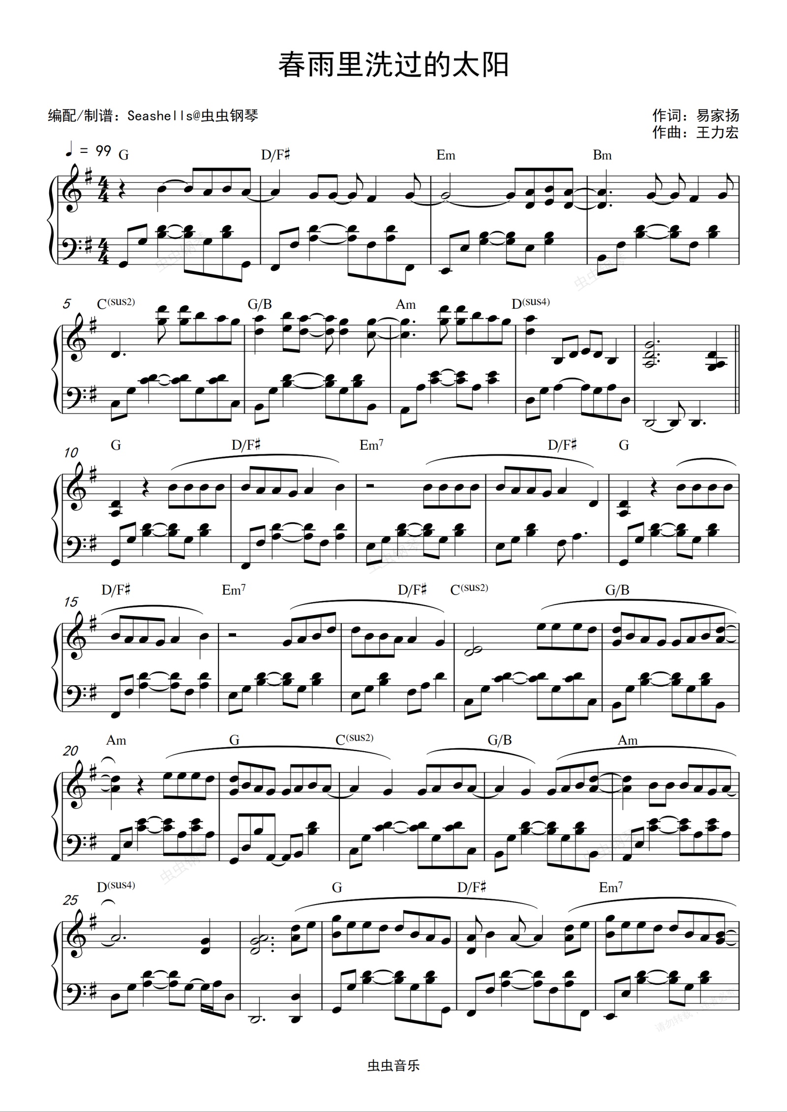 钢琴谱:王力宏-《春雨里洗过的太阳》精编钢琴独奏(G调)