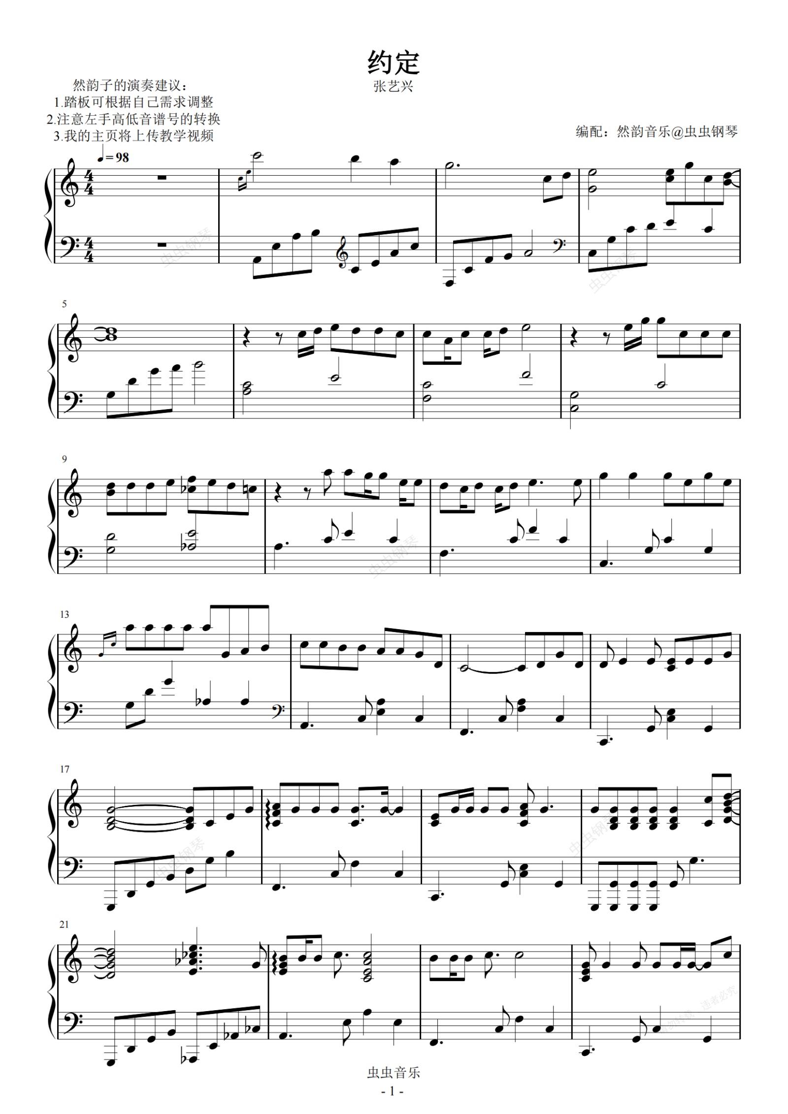 钢琴谱:【C调】约定-张艺兴 钢琴极限还原 然韵音乐编配