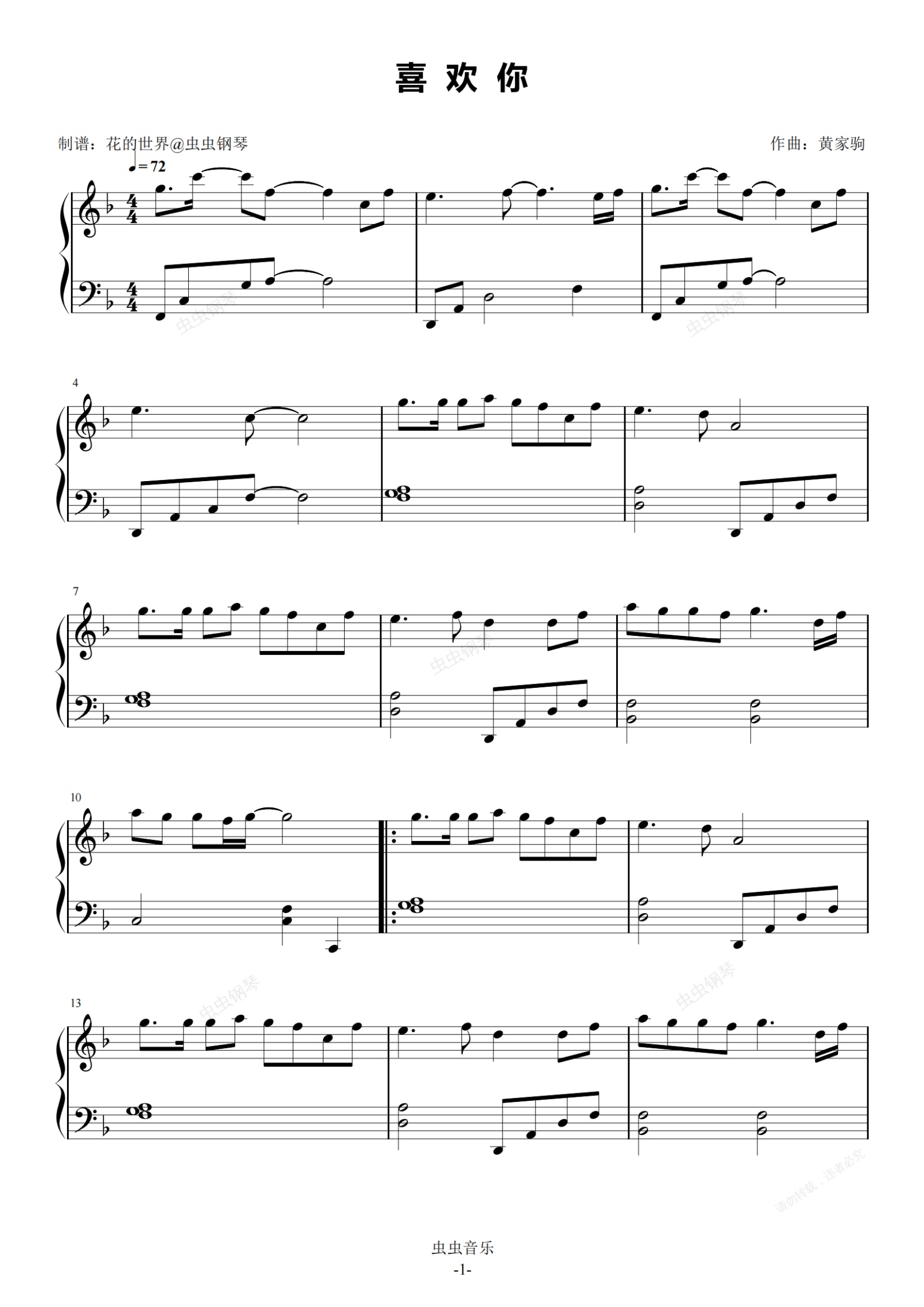 钢琴谱:喜欢你 原调简易版 邓紫棋