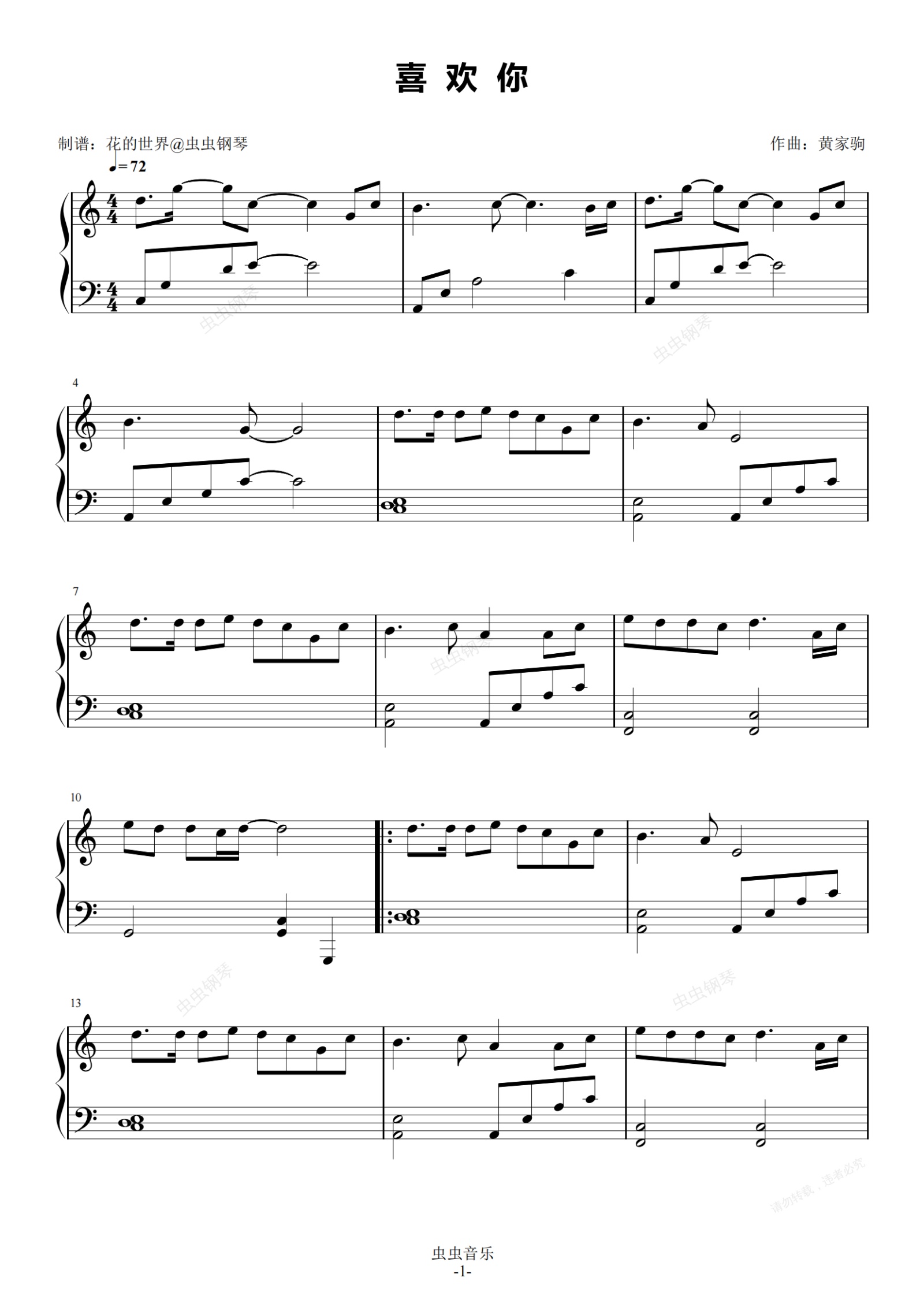 钢琴谱:喜欢你 C调简易版 邓紫棋