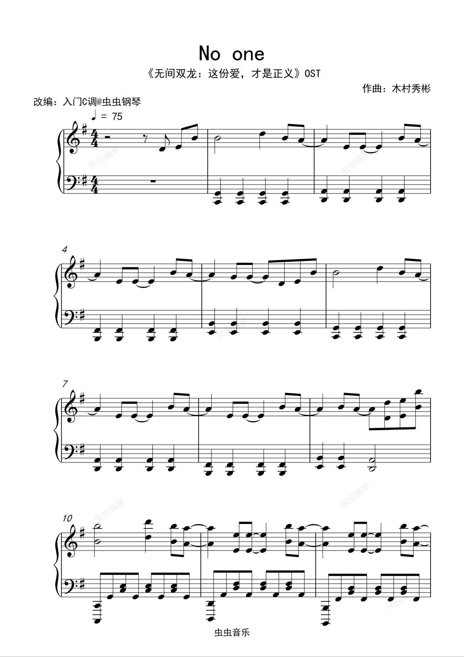 钢琴谱:日剧《无间双龙》BGM《No one》G调版本