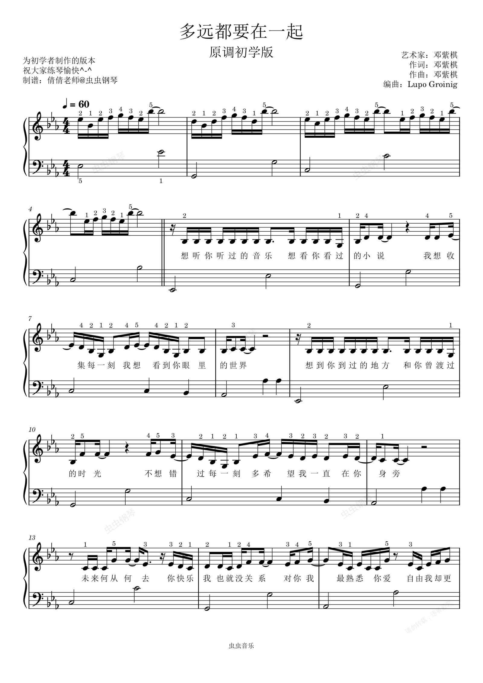 钢琴谱:多远都要在一起-原调初学简易版-邓紫棋
