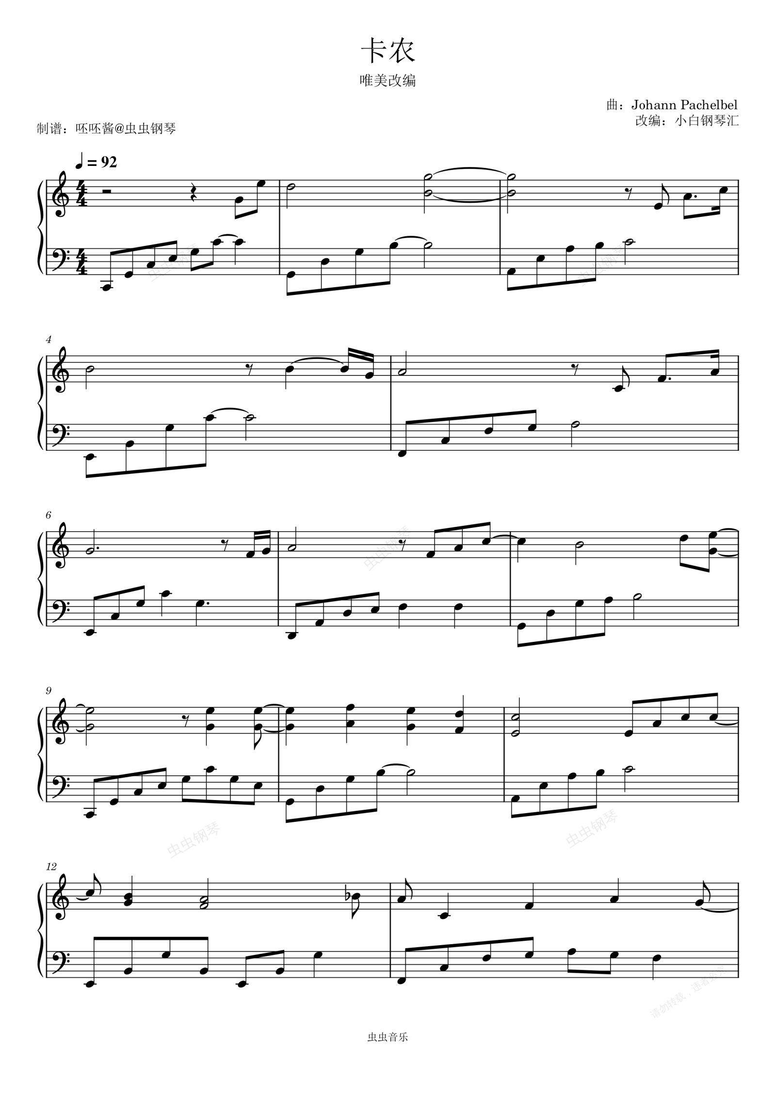 钢琴谱:卡农-唯美改编【中级难度】-C调