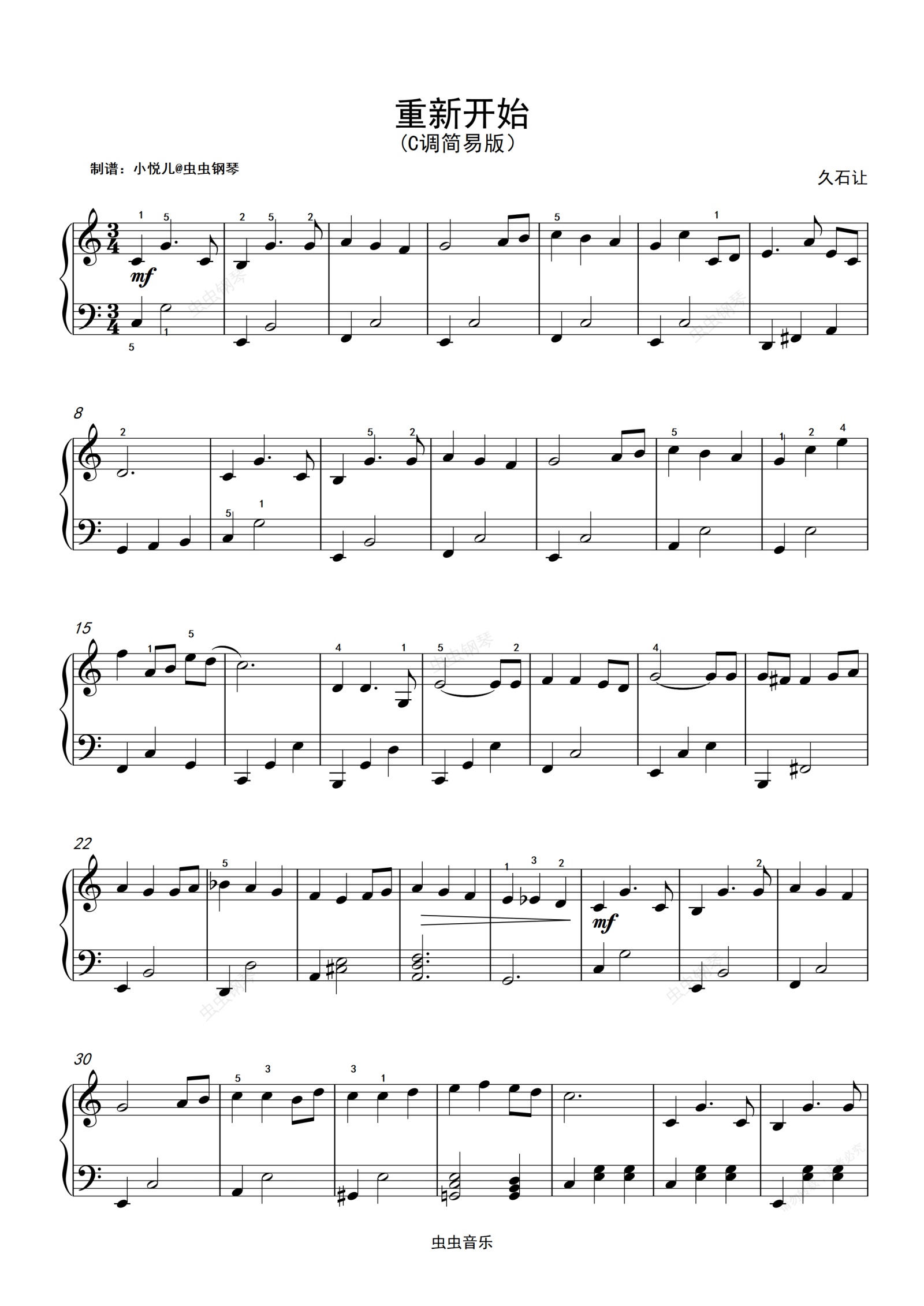 钢琴谱:重新开始(千与千寻背景曲)C调简易版