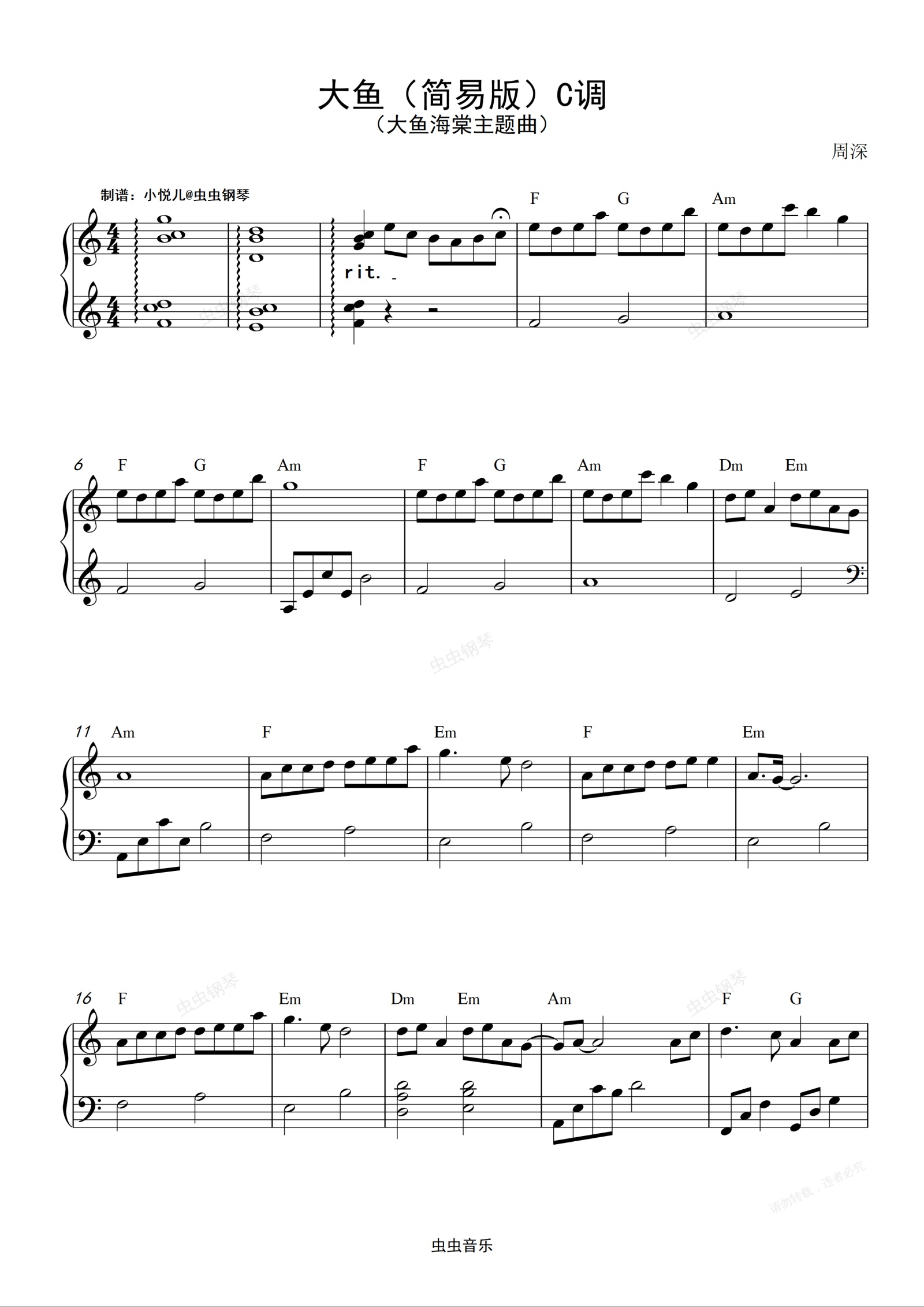 钢琴谱:大鱼(大鱼海棠主题曲)C调简易版