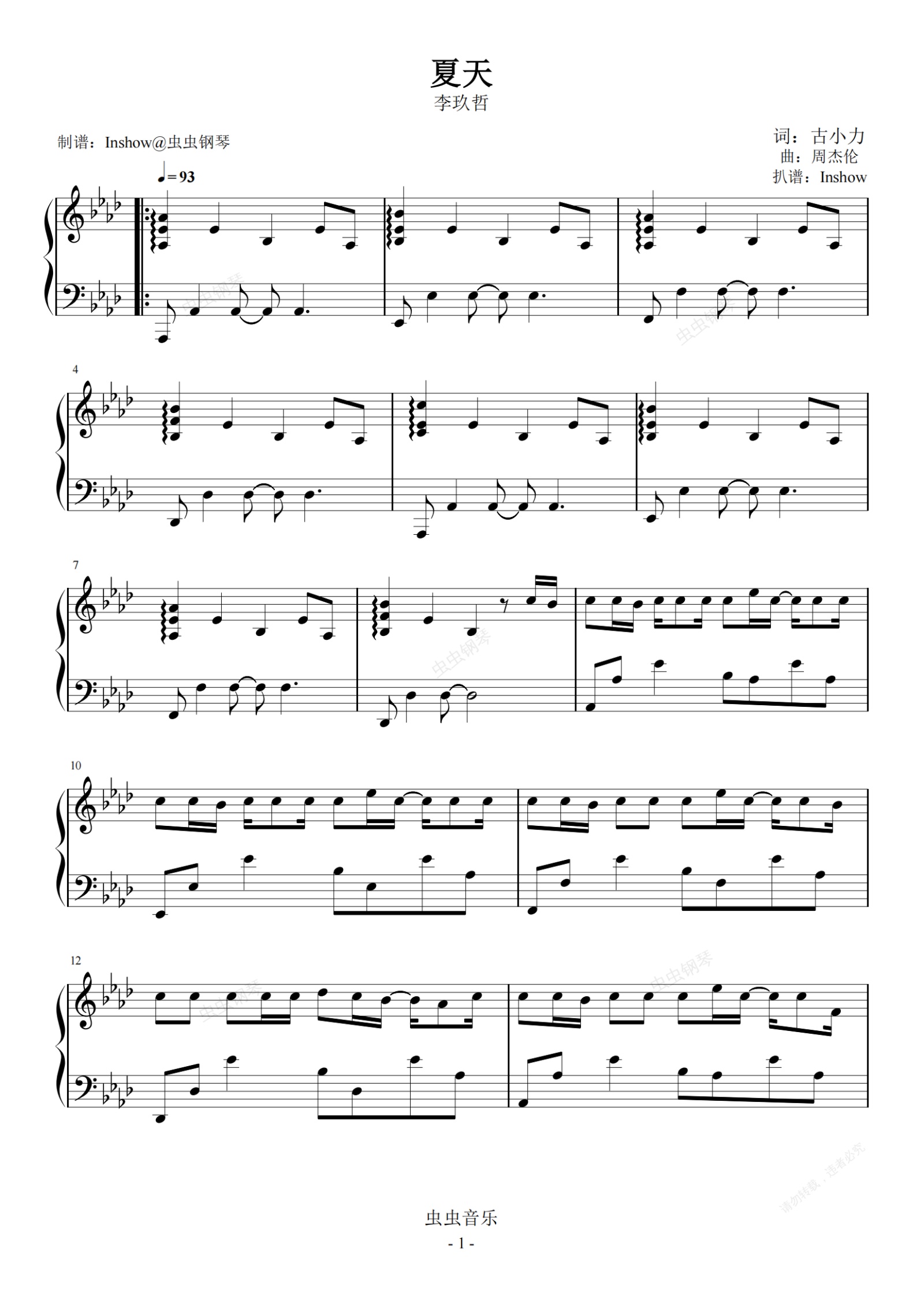 钢琴谱:夏天【独奏】- 李玖哲 -
