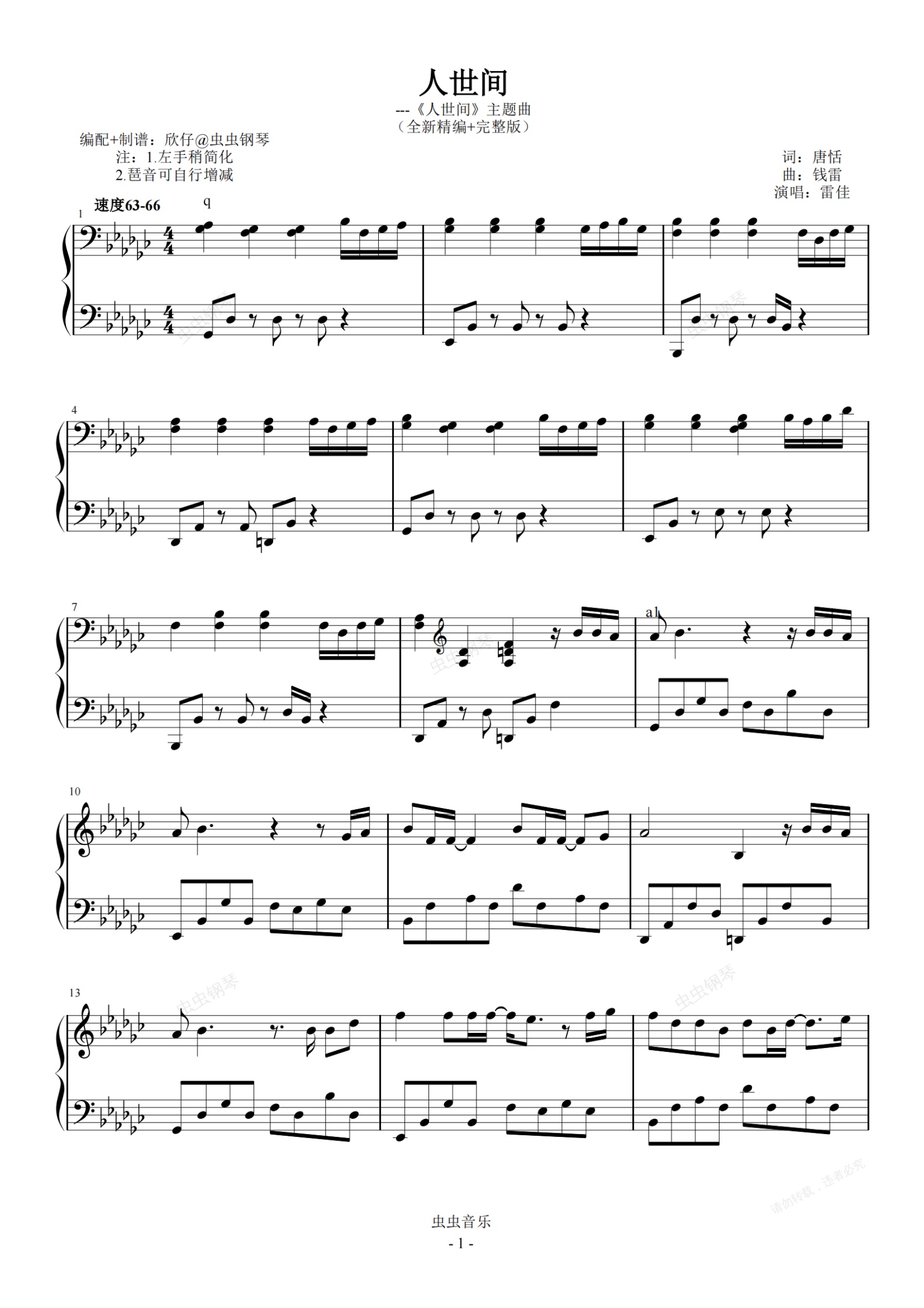钢琴谱:补发-调号降G-《人世间》(全新精编+完整版)