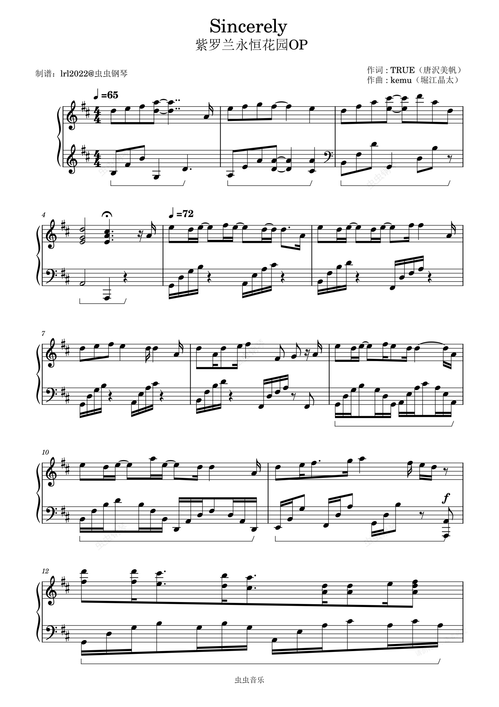 钢琴谱:Sincerely-简单版-紫罗兰永恒花园OP-唐沢美帆-TRUE