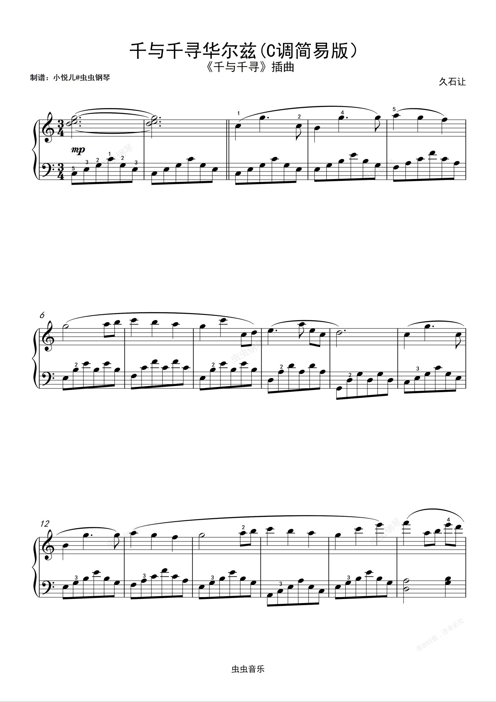 钢琴谱:千寻的华尔兹(C调简易版)