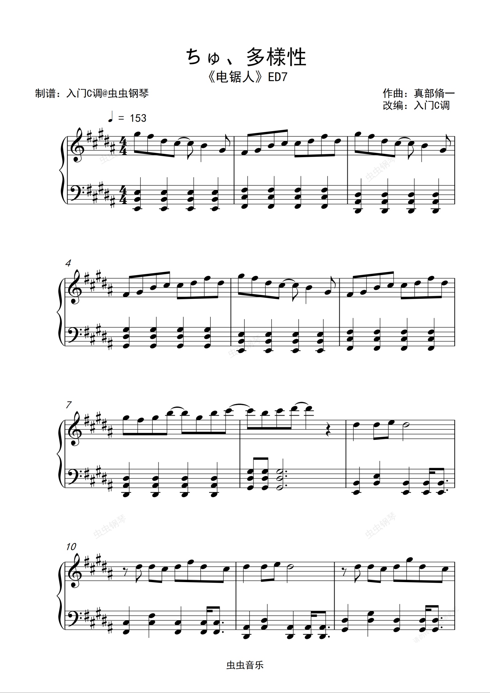 钢琴谱:《电锯人》ED7原调完整版《ちゅ、多様性。》