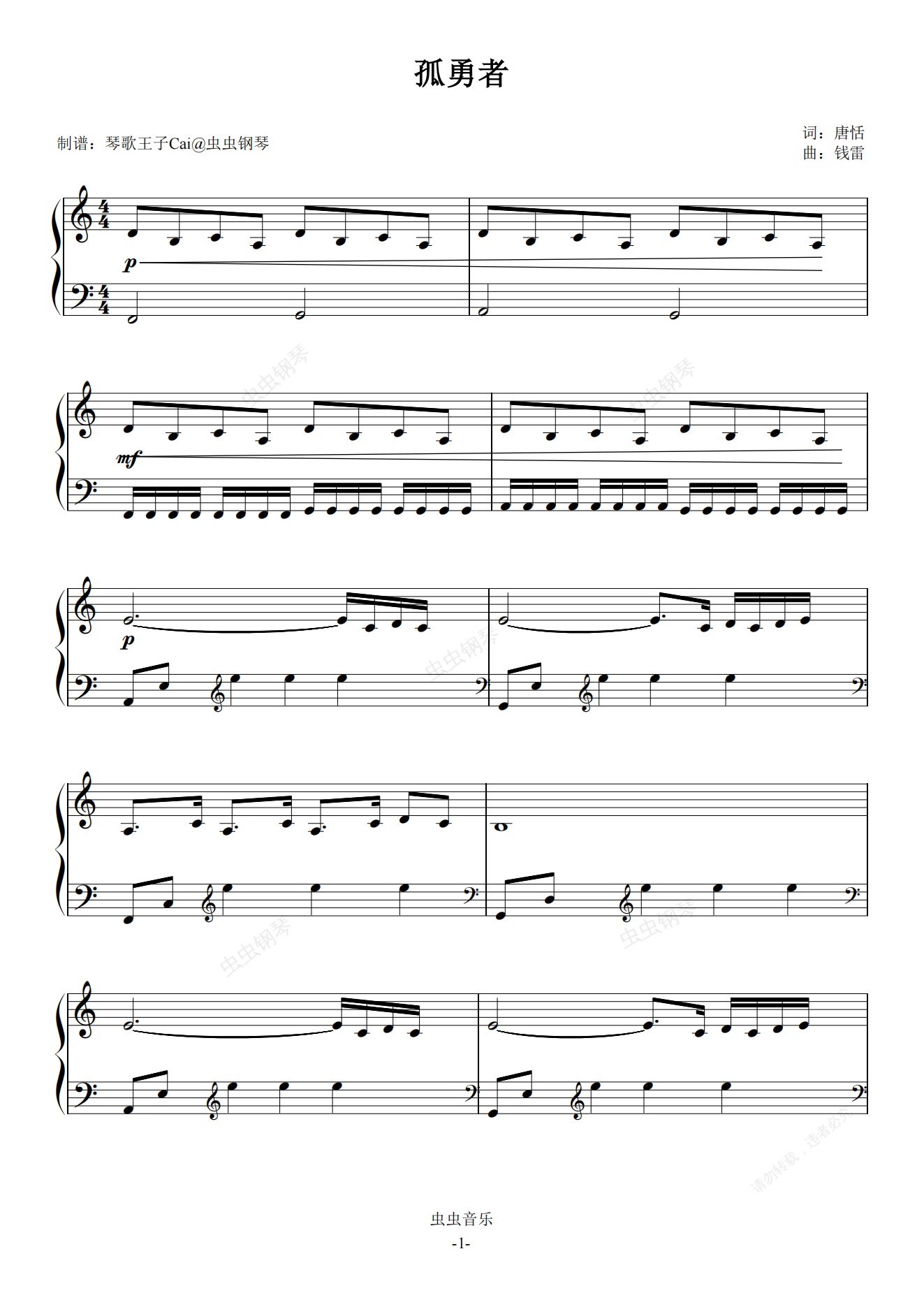 钢琴谱:孤勇者(初级版)琴歌王子Cai钢琴版