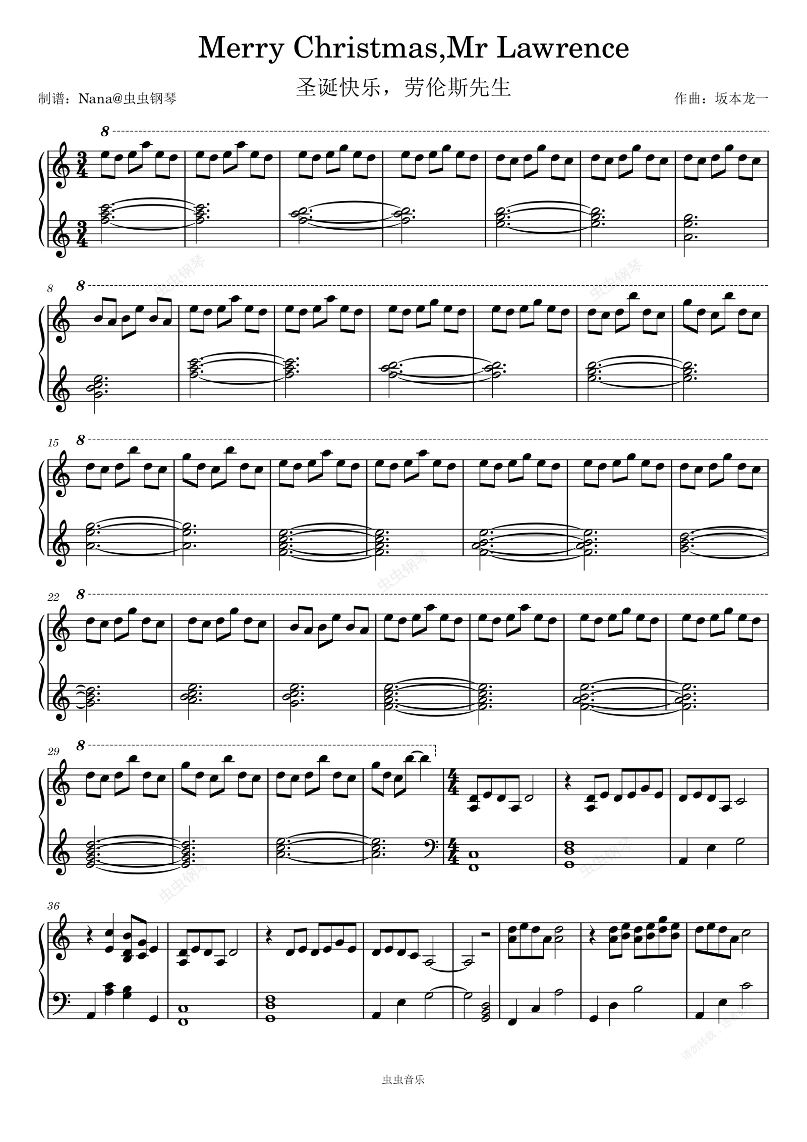 钢琴谱:圣诞快乐,劳伦斯先生 C调版,坂本龙一