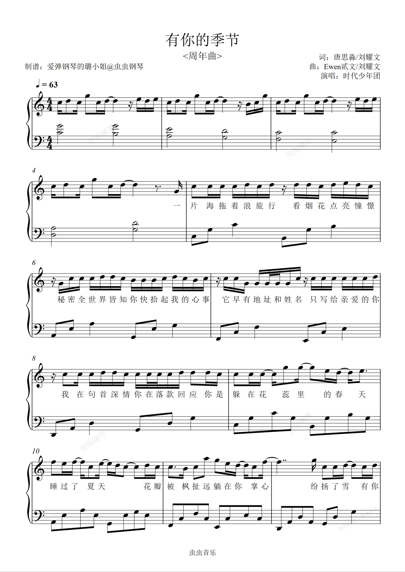 钢琴谱:有你的季节- 时代少年团 - C调最简单易弹版 - 附歌词
