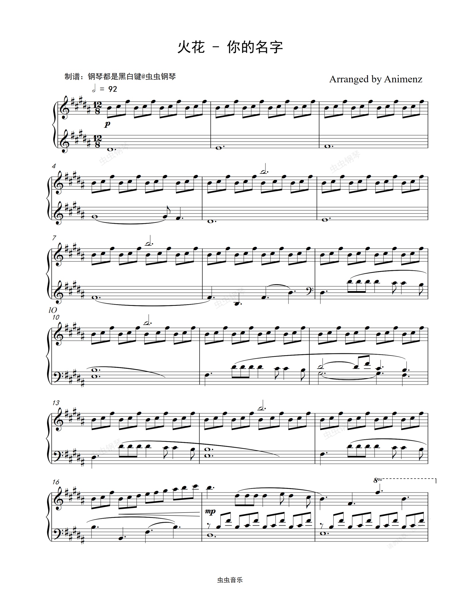 钢琴谱:[Animenz版]火花 - 你的名字 【极限还原版】