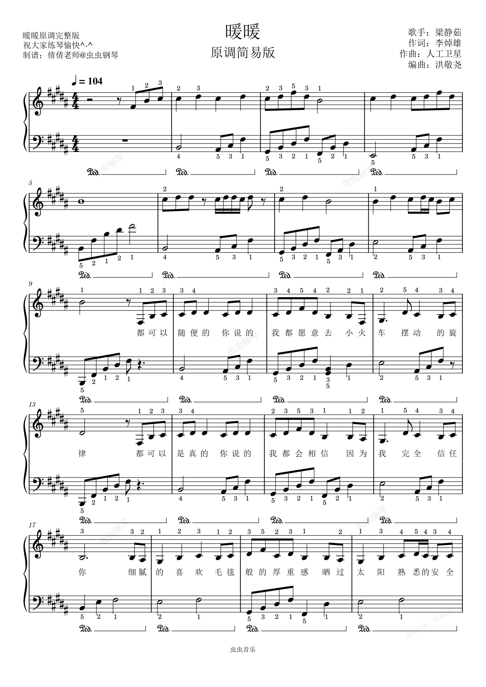 钢琴谱:暖暖-原调完整简易版-梁静茹