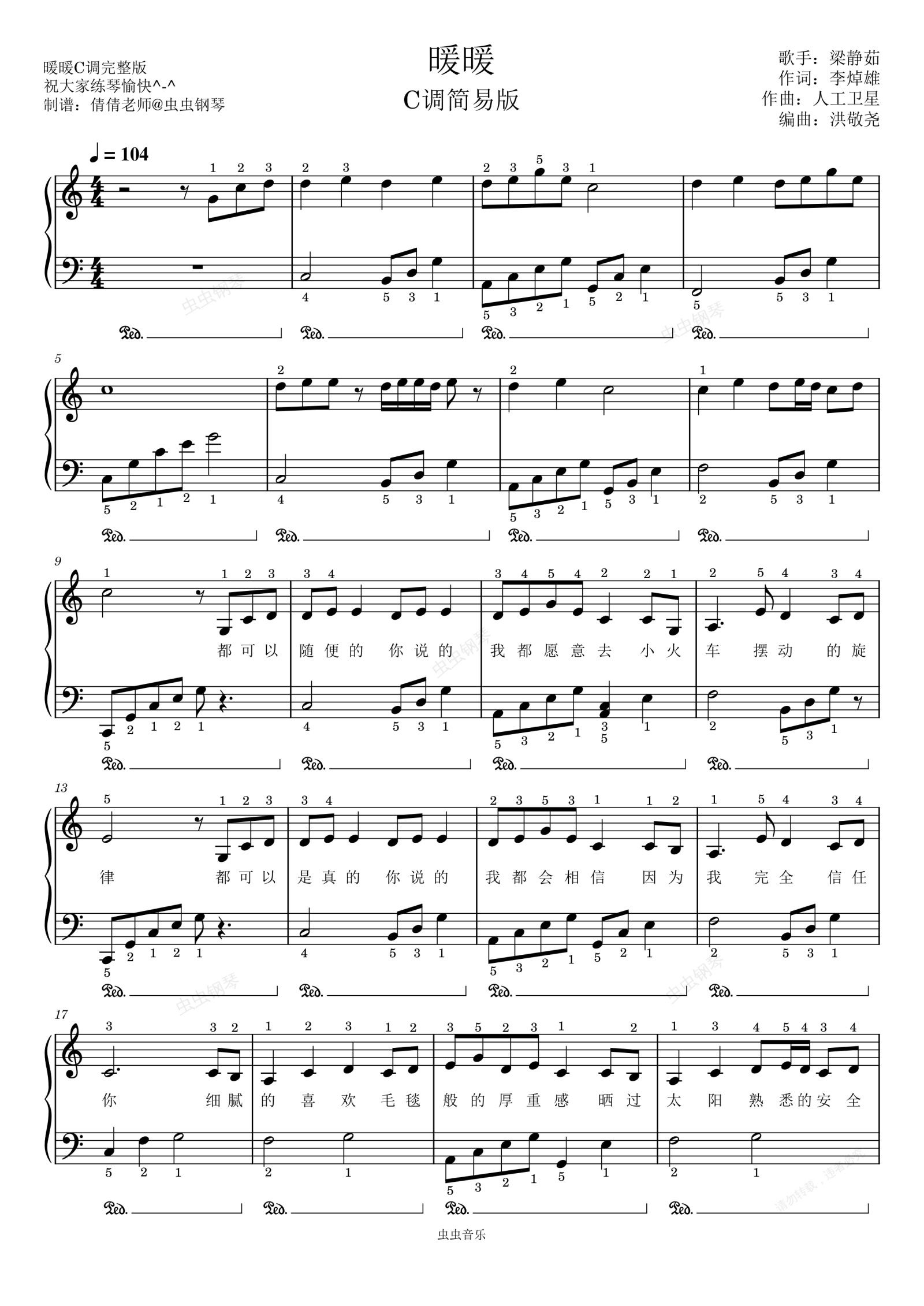 钢琴谱:暖暖-C调完整简易版-梁静茹
